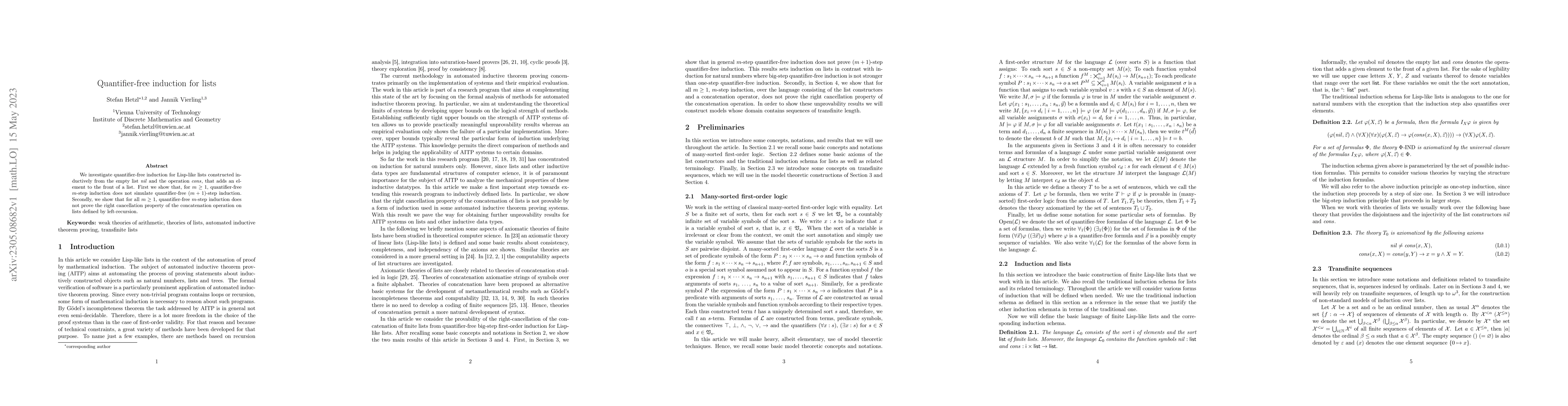 Summary: This paper examines quantifier-free induction techniques for Lisp-like lists, demonstrating that $m$-step induction cannot simulate $(m+1)$-step induction and fails to prove the right cancellation property of list concatenation.