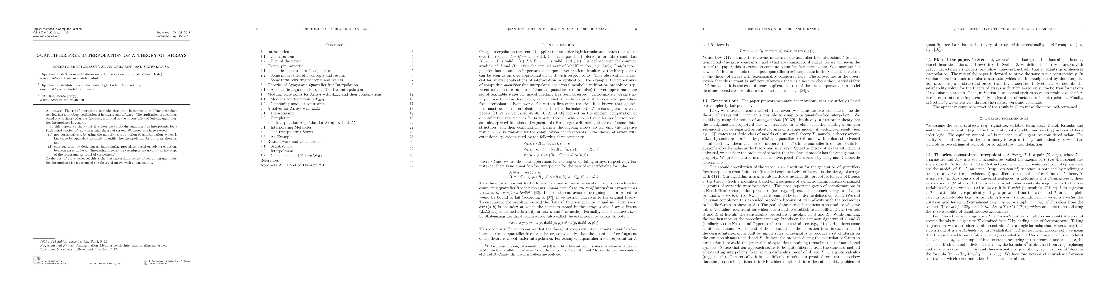 Researchers have successfully developed a method to generate quantifier-free interpolants for a theory of arrays with extensionality, enabling faster and more robust verification in model checking.