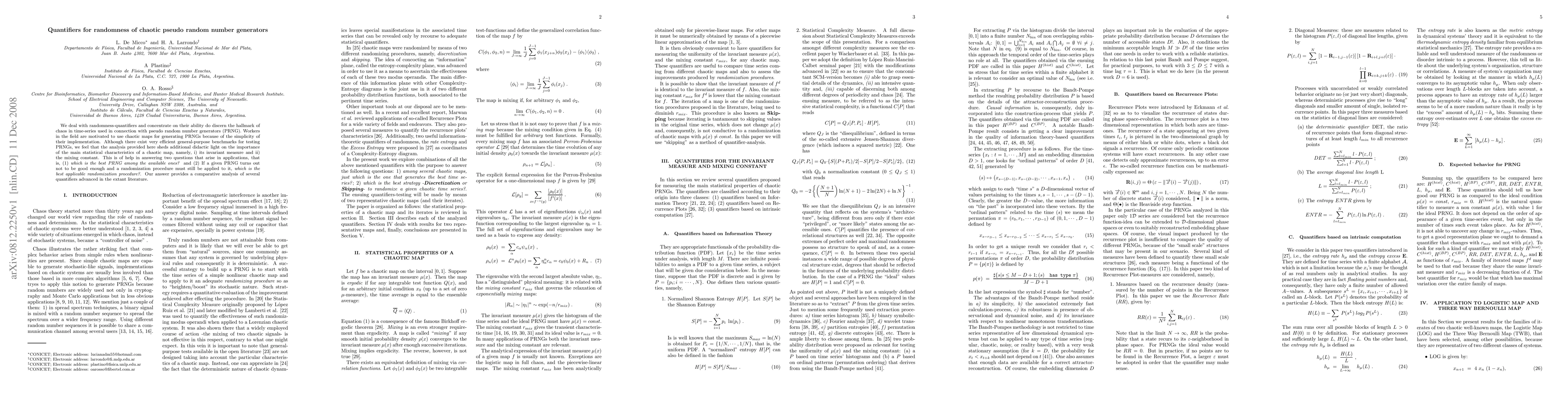 This paper evaluates various quantifiers to assess the randomness of chaotic pseudo random number generators (PRNGs), focusing on their ability to discern chaotic characteristics. It highlights the importance of statistical features like invariant measure and mixing constant in determining the best PRNG and applicable randomization procedures.