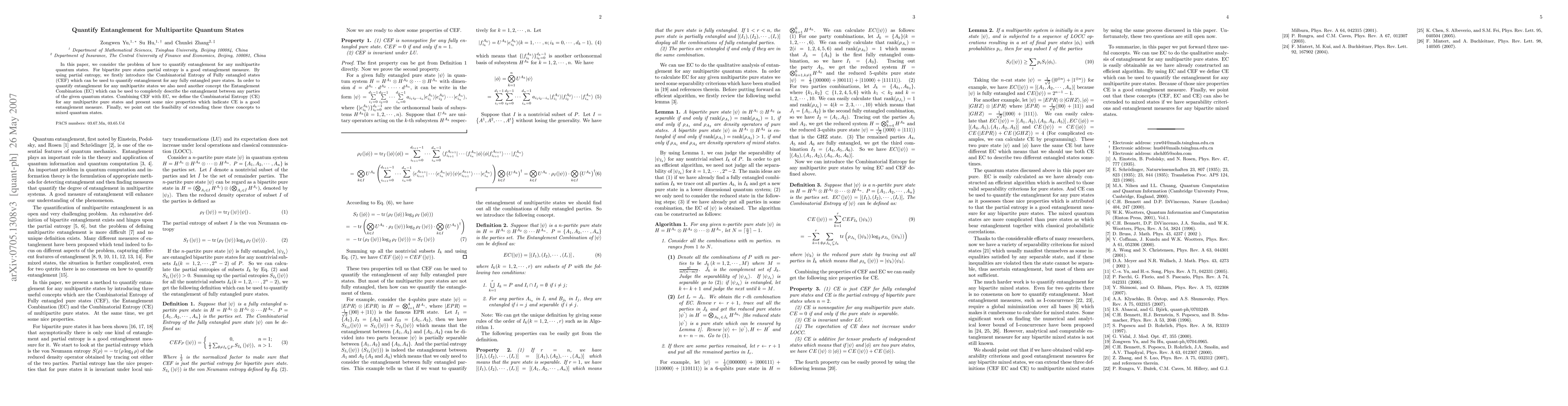 In this paper, we consider the problem of how to quantify entanglement for any multipartite quantum states. For bipartite pure states partial entropy is a good entanglement measure. By using partial entropy, we firstly introduce the Combinatorial Entropy of Fully entangled states (CEF) which can be used to quantify entanglement for any fully entangled pure states. In order to quantify entanglement for any multipartite states we also need another concept the Entanglement Combination (EC) which can be used to completely describe the entanglement between any parties of the given quantum states. Combining CEF with EC, we define the Combinatorial Entropy (CE) for any multipartite pure states and present some nice properties which indicate CE is a good entanglement measure. Finally, we point out the feasibility of extending these three concepts to mixed quantum states.