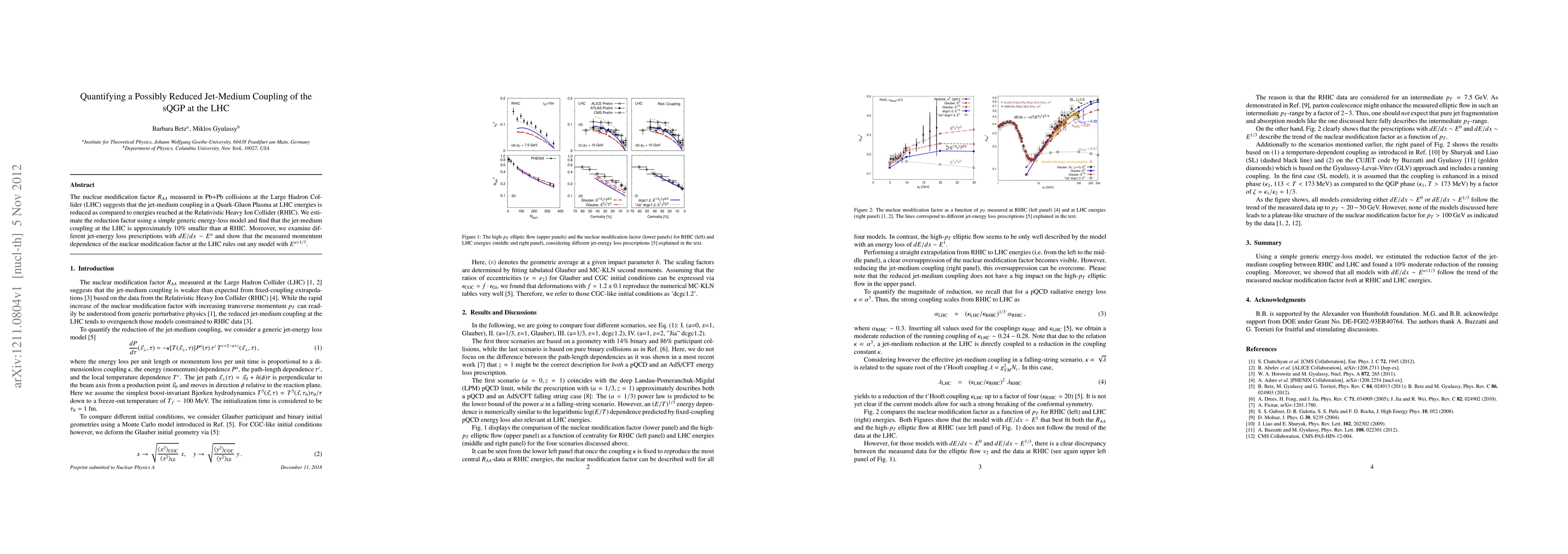 The nuclear modification factor R_{AA} measured in Pb+Pb collisions at the Large Hadron Collider (LHC) suggests that the jet-medium coupling in a Quark-Gluon Plasma at LHC energies is reduced as compared to energies reached at the Relativistic Heavy Ion Collider (RHIC). We estimate the reduction factor using a simple generic energy-loss model and find that the jet-medium coupling at the LHC is approximately 10% smaller than at RHIC. Moreover, we examine different jet-energy loss prescriptions with $dE/dx\sim E^a$ and show that the measured momentum dependence of the nuclear modification factor at the LHC rules out any model with $E^{a>1/3}$.
