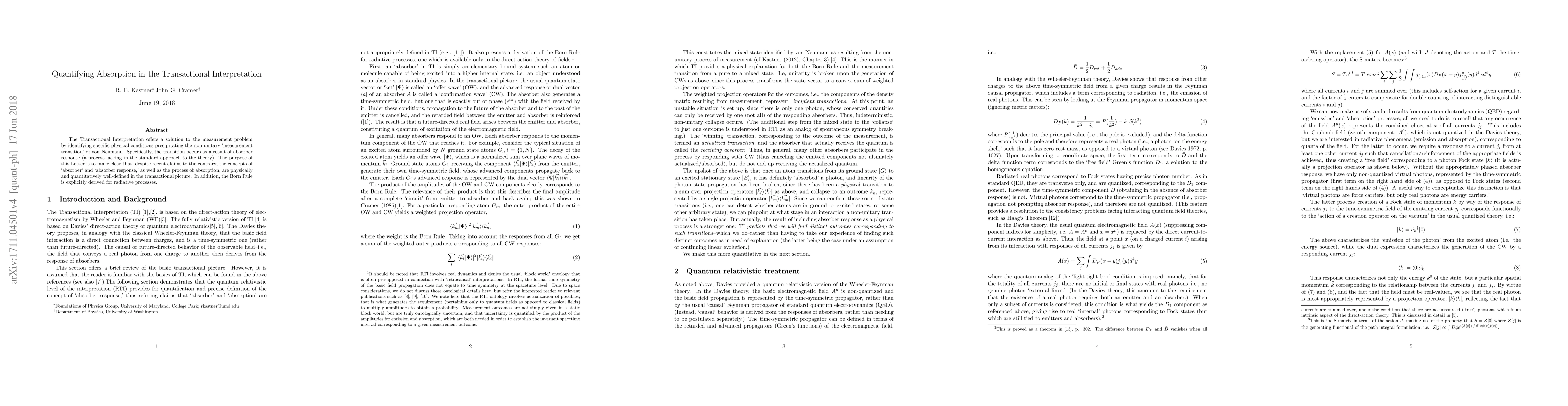 The Transactional Interpretation offers a solution to the measurement problem by identifying specific physical conditions precipitating the non-unitary `measurement transition' of von Neumann. Specifically, the transition occurs as a result of absorber response (a process lacking in the standard approach to the theory). The purpose of this Letter is to make clear that, despite recent claims to the contrary, the concepts of `absorber' and `absorber response,' as well as the process of absorption, are physically and quantitatively well-defined in the transactional picture. In addition, the Born Rule is explicitly derived for radiative processes.