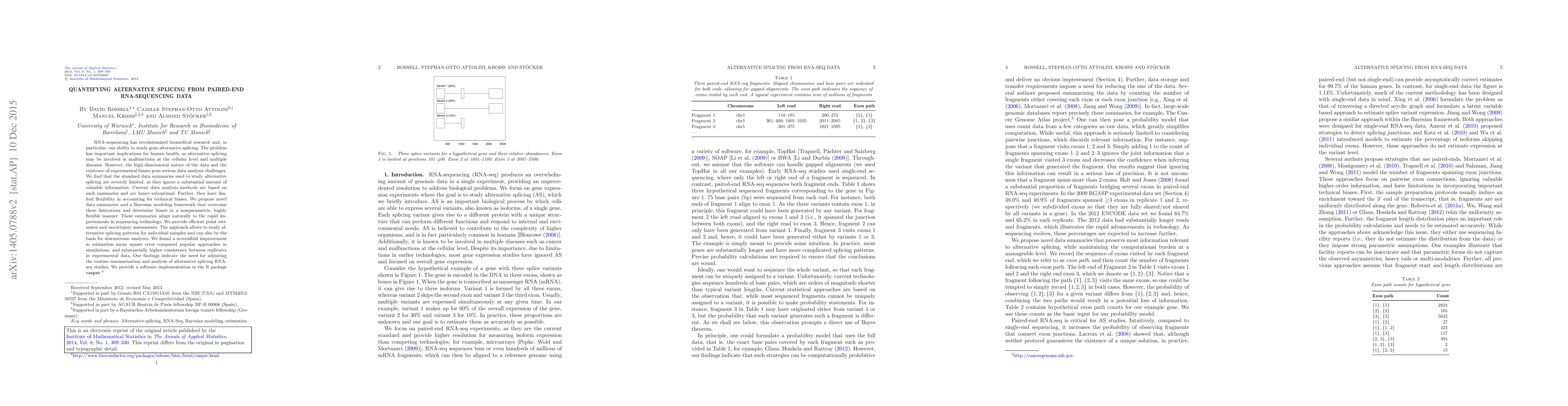 The research proposes a model to estimate the expression of known alternatively spliced variants from RNA-seq data, using exon paths which are more informative than single or pairwise exon counts. It flexibly estimates fragment start and length distributions.