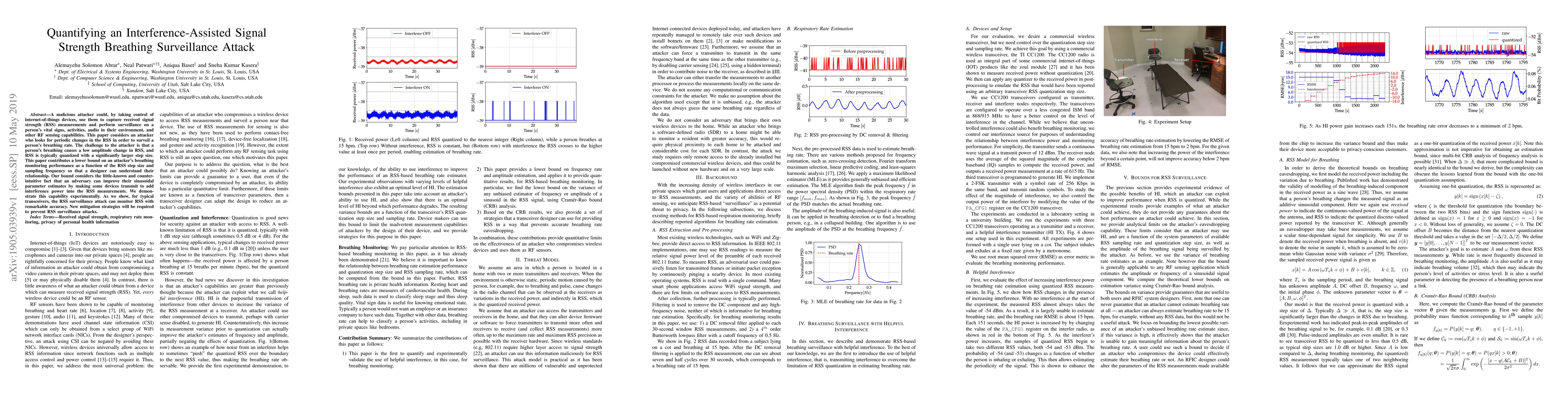 This paper quantifies an interference-assisted signal strength surveillance attack where an attacker uses IoT devices to monitor a person's breathing rate by detecting periodic changes in received signal strength. The study provides a lower bound on attack performance, showing that interference can enhance accuracy, and calls for new mitigation strategies to prevent such attacks.