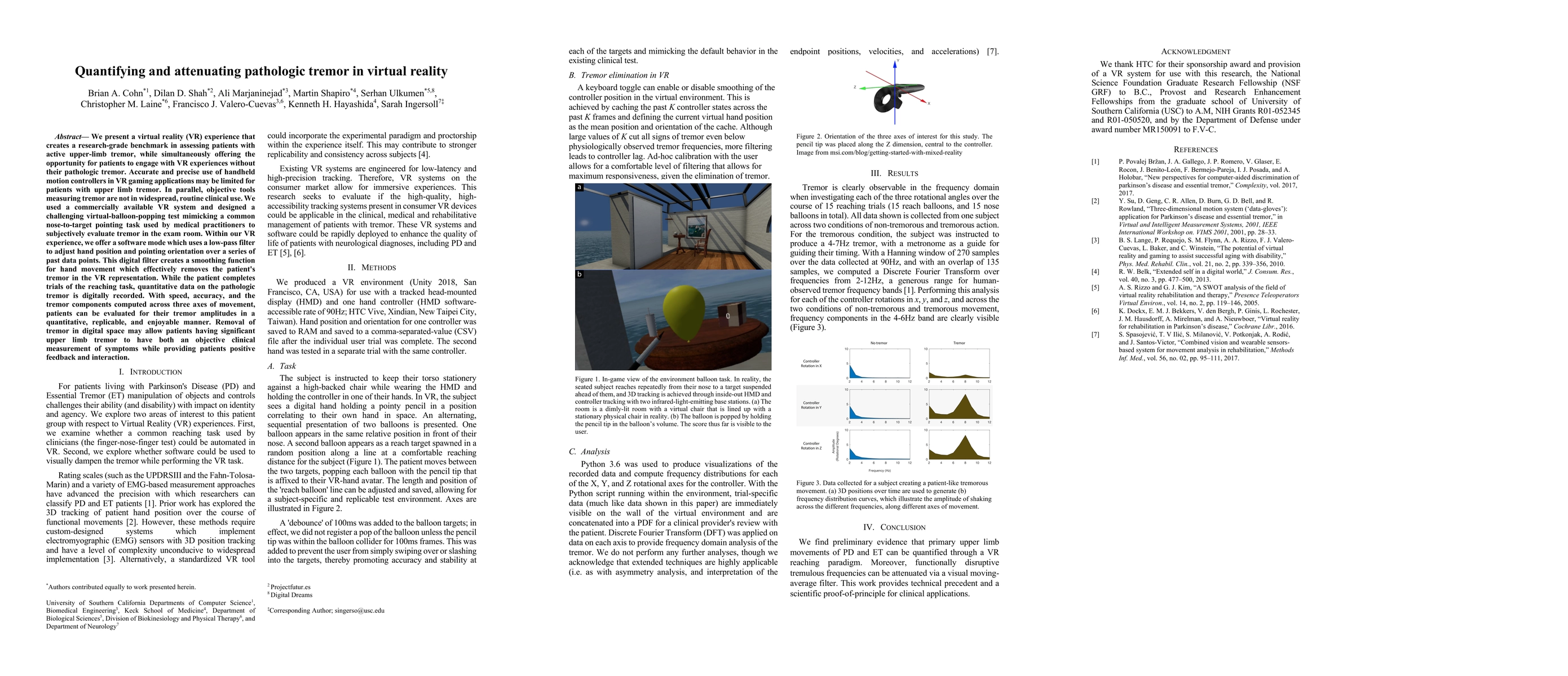 We present a virtual reality (VR) experience that creates a research-grade benchmark in assessing patients with active upper-limb tremor, while simultaneously offering the opportunity for patients to engage with VR experiences without their pathologic tremor. Accurate and precise use of handheld motion controllers in VR gaming applications may be limited for patients with upper limb tremor. In parallel, objective tools measuring tremor are not in widespread, routine clinical use. We used a commercially available VR system and designed a challenging virtual-balloon-popping test mimicking a common nose-to-target pointing task used by medical practitioners to subjectively evaluate tremor in the exam room. Within our VR experience, we offer a software mode which uses a low-pass filter to adjust hand position and pointing orientation over a series of past data points. This digital filter creates a smoothing function for hand movement which effectively removes the patient's tremor in the VR representation. While the patient completes trials of the reaching task, quantitative data on the pathologic tremor is digitally recorded. With speed, accuracy, and the tremor components computed across three axes of movement, patients can be evaluated for their tremor amplitudes in a quantitative, replicable, and enjoyable manner. Removal of tremor in digital space may allow patients having significant upper limb tremor to have both an objective clinical measurement of symptoms while providing patients positive feedback and interaction.