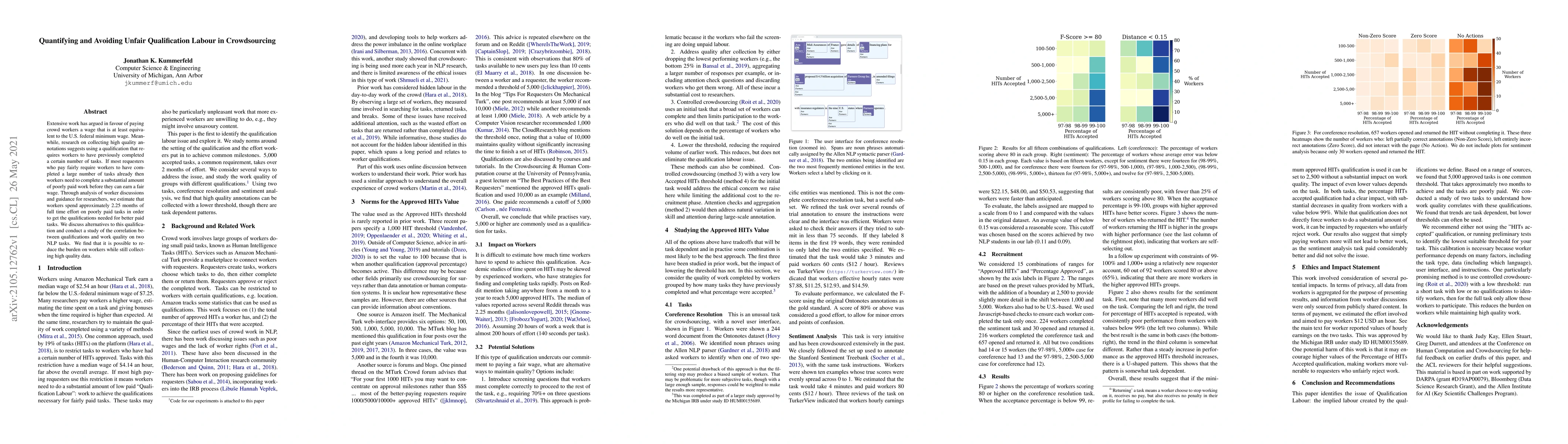 This research highlights the issue of crowd workers having to complete many poorly paid tasks to gain qualifications for better-paid work, estimated at 2.25 months of full-time effort. It proposes alternatives to current qualification systems and demonstrates that high-quality data can still be collected with reduced worker burden.