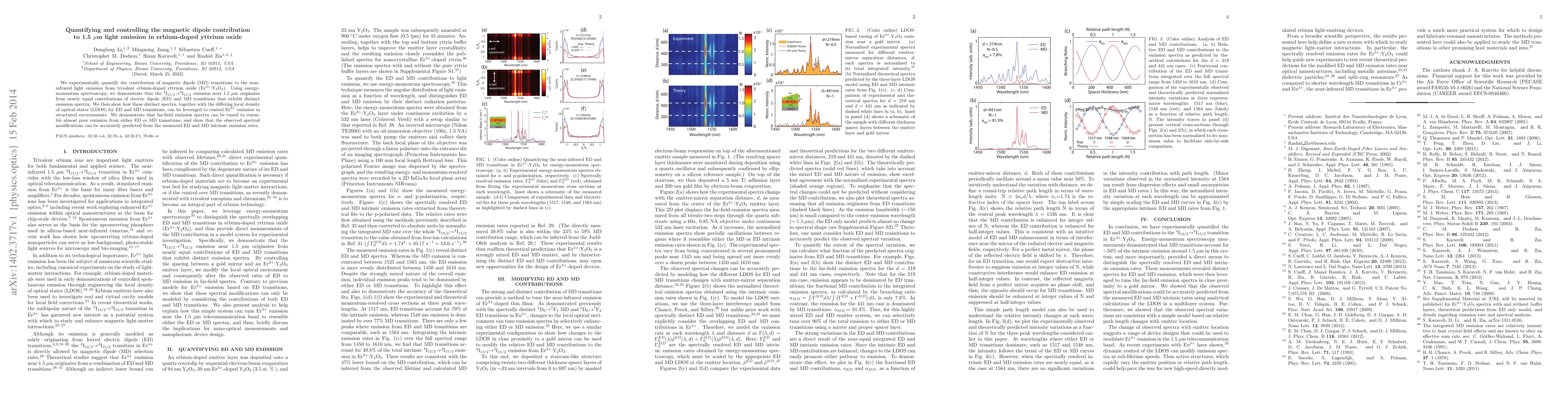 We experimentally quantify the contribution of magnetic dipole (MD) transitions to the near-infrared light emission from trivalent erbium-doped yttrium oxide (Er$^{3+}$:Y$_2$O$_3$). Using energy-momentum spectroscopy, we demonstrate that the $^4$I$_{13/2}{\to}^4$I$_{15/2}$ emission near 1.5 $\mu$m originates from nearly equal contributions of electric dipole (ED) and MD transitions that exhibit distinct emission spectra. We then show how these distinct spectra, together with the differing local density of optical states (LDOS) for ED and MD transitions, can be leveraged to control Er$^{3+}$ emission in structured environments. We demonstrate that far-field emission spectra can be tuned to resemble almost pure emission from either ED or MD transitions, and show that the observed spectral modifications can be accurately predicted from the measured ED and MD intrinsic emission rates.
