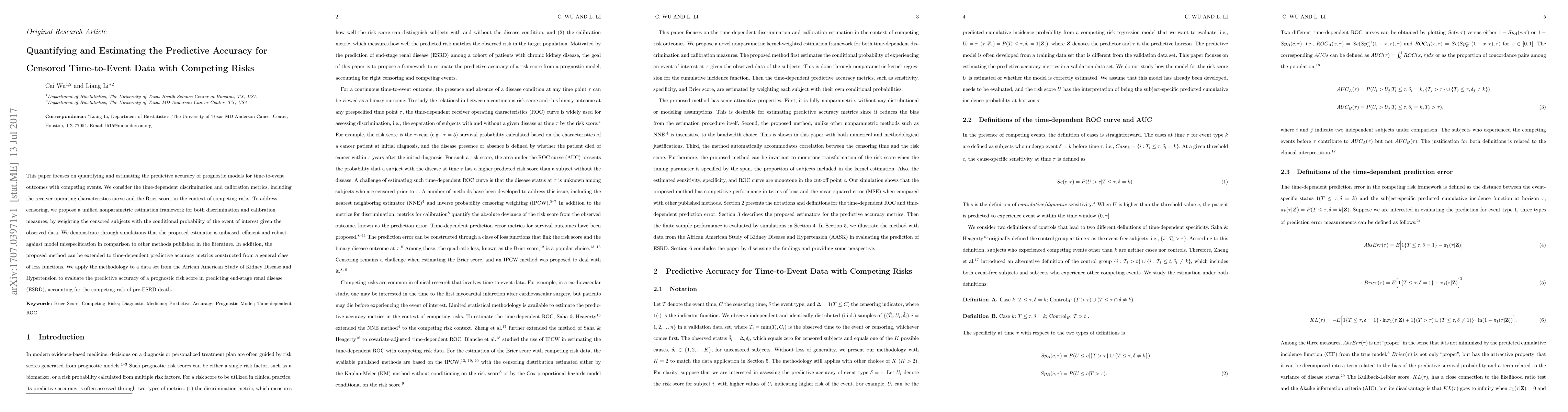This paper proposes a unified nonparametric framework for estimating predictive accuracy in time-to-event data with competing risks, demonstrating its unbiasedness and efficiency through simulations. The method is applied to assess a prognostic risk score for end-stage renal disease, accounting for the competing risk of death.