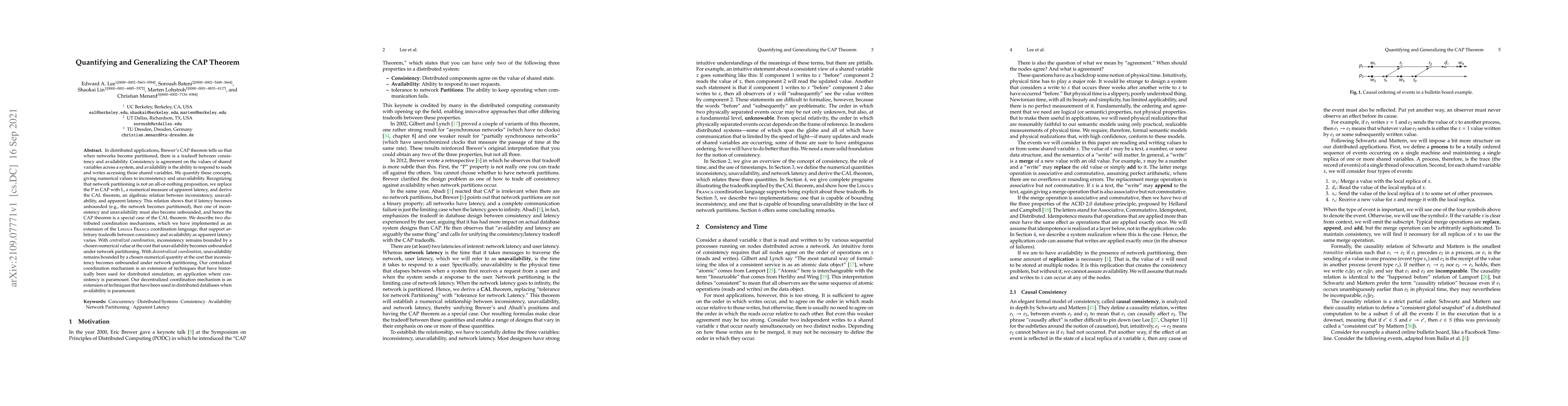 In distributed applications, Brewer's CAP theorem tells us that when networks become partitioned, there is a tradeoff between consistency and availability. Consistency is agreement on the values of shared variables across a system, and availability is the ability to respond to reads and writes accessing those shared variables. We quantify these concepts, giving numerical values to inconsistency and unavailability. Recognizing that network partitioning is not an all-or-nothing proposition, we replace the P in CAP with L, a numerical measure of apparent latency, and derive the CAL theorem, an algebraic relation between inconsistency, unavailability, and apparent latency. This relation shows that if latency becomes unbounded (e.g., the network becomes partitioned), then one of inconsistency and unavailability must also become unbounded, and hence the CAP theorem is a special case of the CAL theorem. We describe two distributed coordination mechanisms, which we have implemented as an extension of the Lingua Franca coordination language, that support arbitrary tradeoffs between consistency and availability as apparent latency varies. With centralized coordination, inconsistency remains bounded by a chosen numerical value at the cost that unavailability becomes unbounded under network partitioning. With decentralized coordination, unavailability remains bounded by a chosen numerical quantity at the cost that inconsistency becomes unbounded under network partitioning. Our centralized coordination mechanism is an extension of techniques that have historically been used for distributed simulation, an application where consistency is paramount. Our decentralized coordination mechanism is an extension of techniques that have been used in distributed databases when availability is paramount.