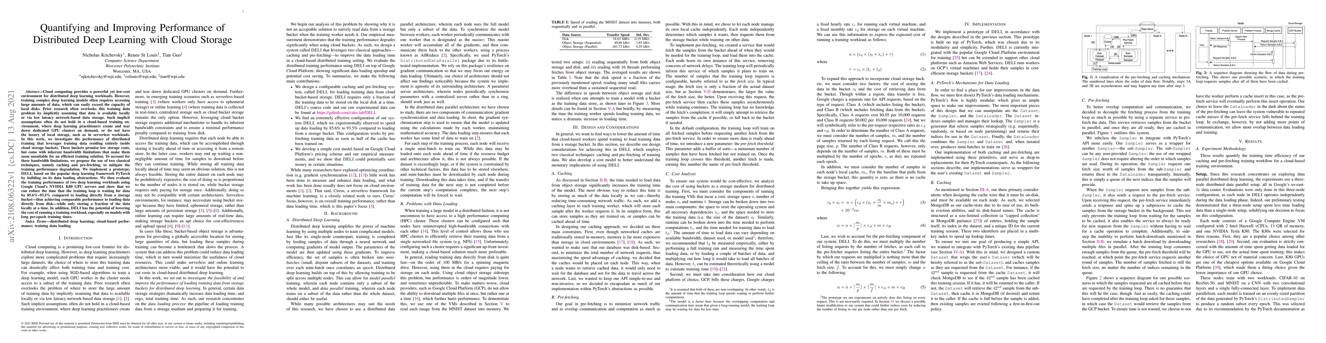This paper investigates the performance of distributed deep learning training using cloud storage, addressing the challenge of large data volumes exceeding local storage capacity. The authors propose caching and pre-fetching techniques to mitigate bandwidth limitations, implementing a prototype, DELI, which reduces data loading wait times by 85.6%-93.5% compared to direct storage bucket access, achieving comparable performance to local disk loading.