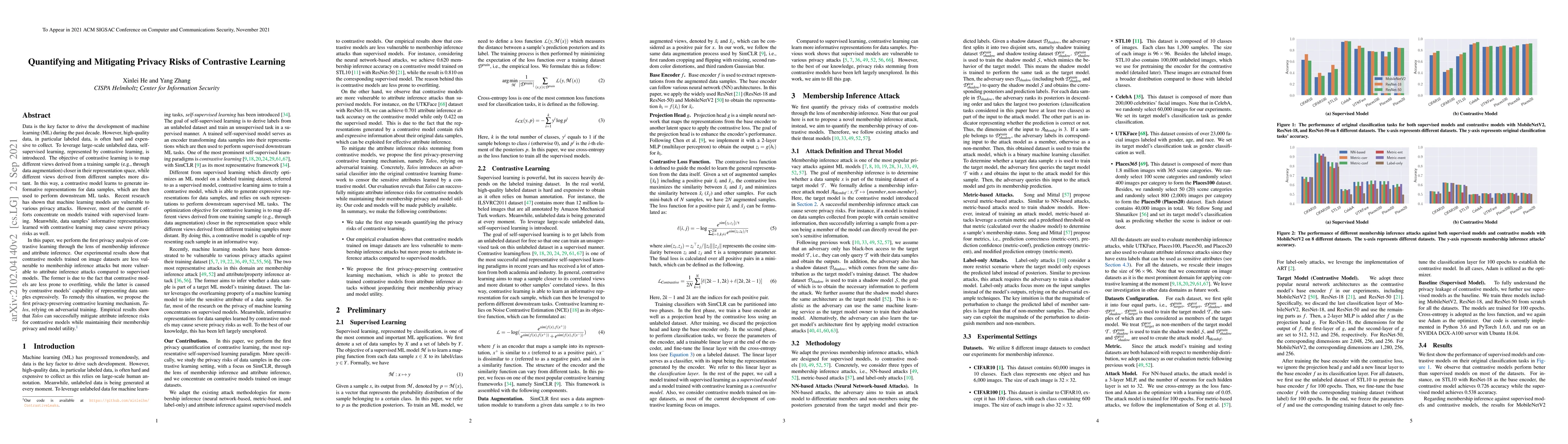 This paper investigates the privacy risks associated with contrastive learning, revealing that while it is less susceptible to membership inference attacks, it is more vulnerable to attribute inference attacks compared to supervised learning models. To address these risks, the authors propose Talos, a privacy-preserving mechanism based on adversarial training, which effectively mitigates attribute inference risks without compromising membership privacy or model utility.