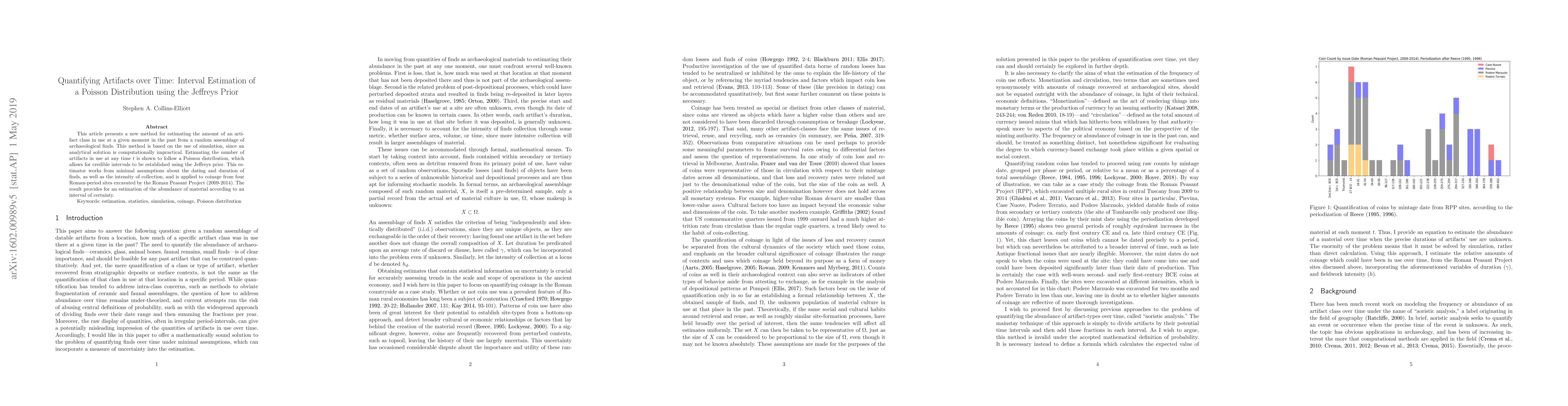 This article presents a new method for estimating the amount of an artifact class in use at a given moment in the past from a random assemblage of archaeological finds. This method is based on the use of simulation, since an analytical solution is computationally impractical. Estimating the number of artifacts in use at any time $t$ is shown to follow a Poisson distribution, which allows for credible intervals to be established using the Jeffreys prior. This estimator works from minimal assumptions about the dating and duration of finds, as well as the intensity of collection, and is applied to coinage from four Roman-period sites excavated by the Roman Peasant Project (2009-2014). The result provides for an estimation of the abundance of material according to an interval of certainty.