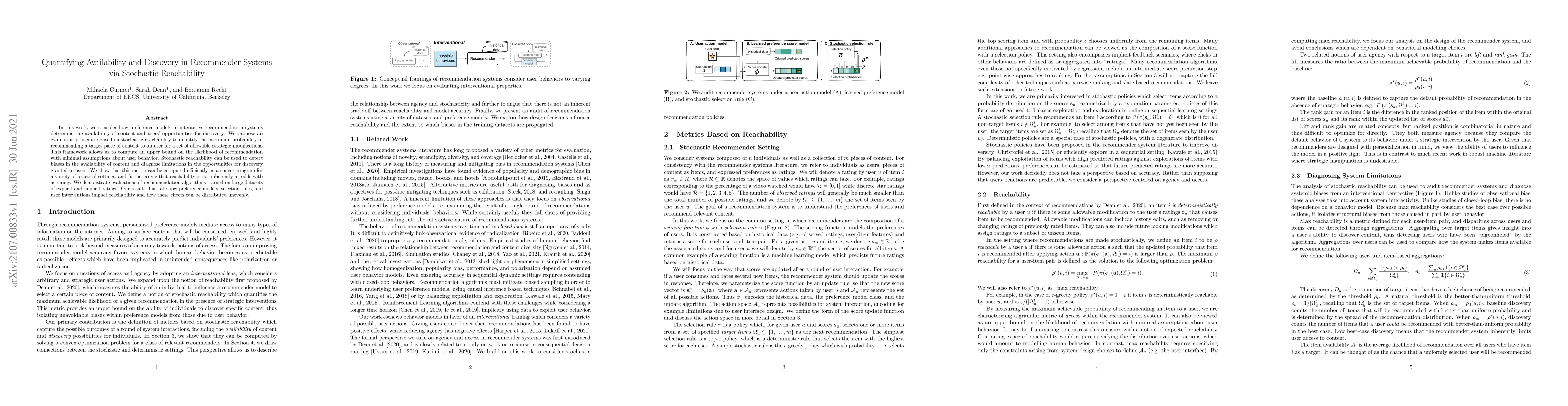 In this work, we consider how preference models in interactive recommendation systems determine the availability of content and users' opportunities for discovery. We propose an evaluation procedure based on stochastic reachability to quantify the maximum probability of recommending a target piece of content to an user for a set of allowable strategic modifications. This framework allows us to compute an upper bound on the likelihood of recommendation with minimal assumptions about user behavior. Stochastic reachability can be used to detect biases in the availability of content and diagnose limitations in the opportunities for discovery granted to users. We show that this metric can be computed efficiently as a convex program for a variety of practical settings, and further argue that reachability is not inherently at odds with accuracy. We demonstrate evaluations of recommendation algorithms trained on large datasets of explicit and implicit ratings. Our results illustrate how preference models, selection rules, and user interventions impact reachability and how these effects can be distributed unevenly.