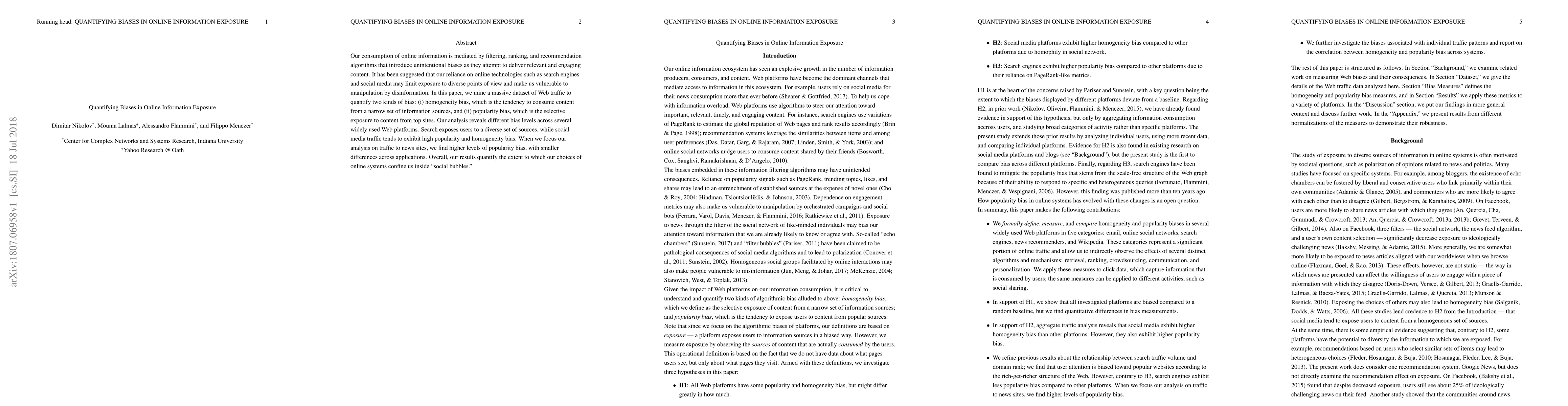 This paper quantifies biases in online information exposure through two types: homogeneity bias and popularity bias, using a large Web traffic dataset. It finds that while search engines offer diverse content, social media exhibits high homogeneity and popularity bias, confining users within "social bubbles."