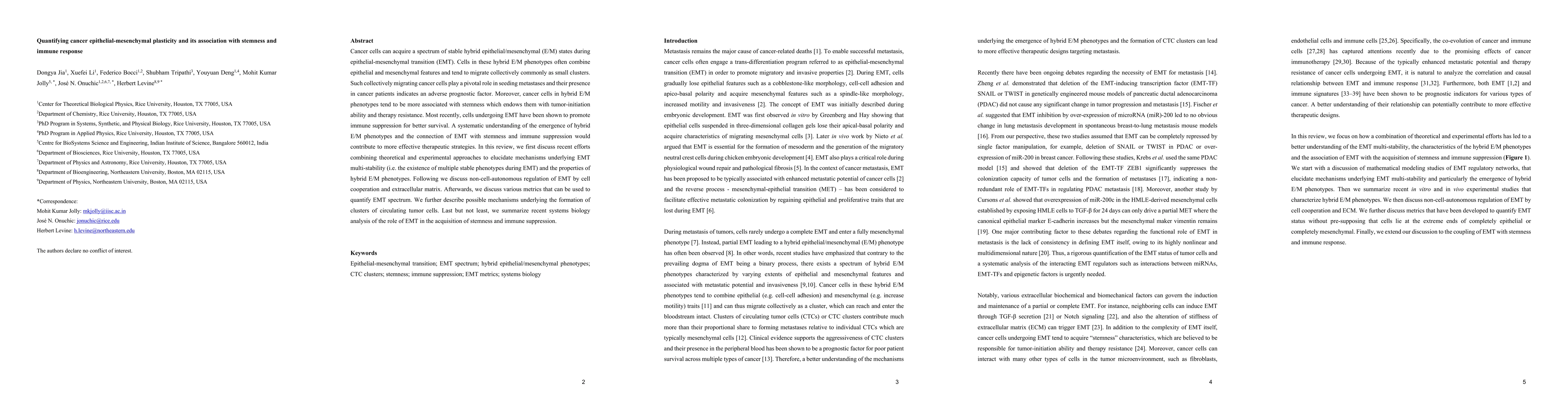 Cancer cells can acquire a spectrum of stable hybrid epithelial/mesenchymal (E/M) states during epithelial-mesenchymal transition (EMT). Cells in these hybrid E/M phenotypes often combine epithelial and mesenchymal features and tend to migrate collectively commonly as small clusters. Such collectively migrating cancer cells play a pivotal role in seeding metastases and their presence in cancer patients indicates an adverse prognostic factor. Moreover, cancer cells in hybrid E/M phenotypes tend to be more associated with stemness which endows them with tumor-initiation ability and therapy resistance. Most recently, cells undergoing EMT have been shown to promote immune suppression for better survival. A systematic understanding of the emergence of hybrid E/M phenotypes and the connection of EMT with stemness and immune suppression would contribute to more effective therapeutic strategies. In this review, we first discuss recent efforts combining theoretical and experimental approaches to elucidate mechanisms underlying EMT multi-stability (i.e. the existence of multiple stable phenotypes during EMT) and the properties of hybrid E/M phenotypes. Following we discuss non-cell-autonomous regulation of EMT by cell cooperation and extracellular matrix. Afterwards, we discuss various metrics that can be used to quantify EMT spectrum. We further describe possible mechanisms underlying the formation of clusters of circulating tumor cells. Last but not least, we summarize recent systems biology analysis of the role of EMT in the acquisition of stemness and immune suppression.
