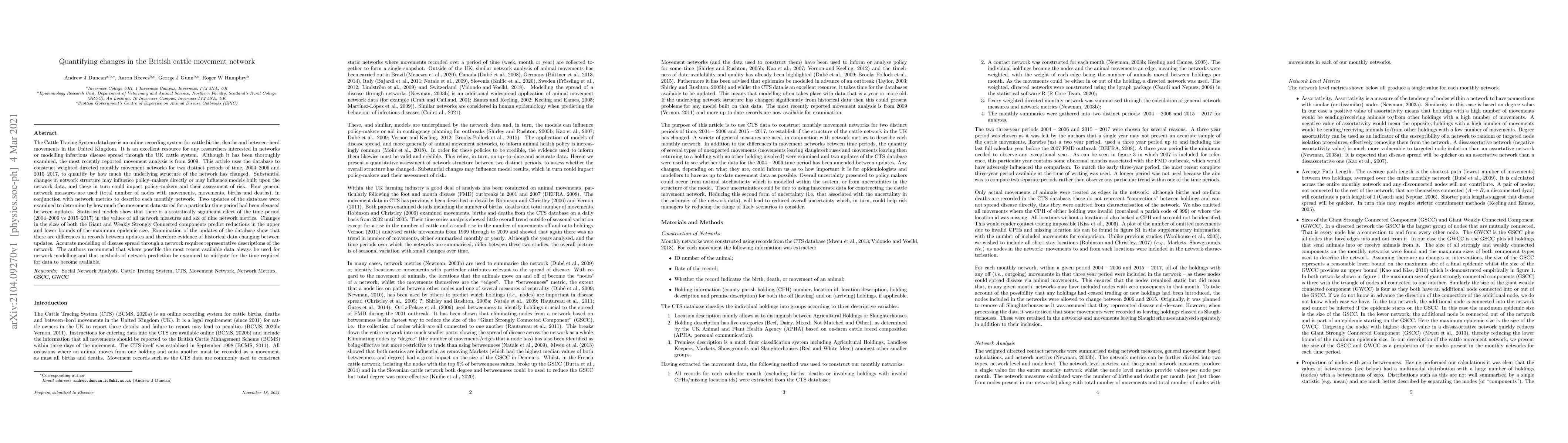 This study analyzed changes in cattle movement networks in the UK between 2004-2006 and 2015-2017, finding significant structural differences and implications for disease modeling and policy-making.