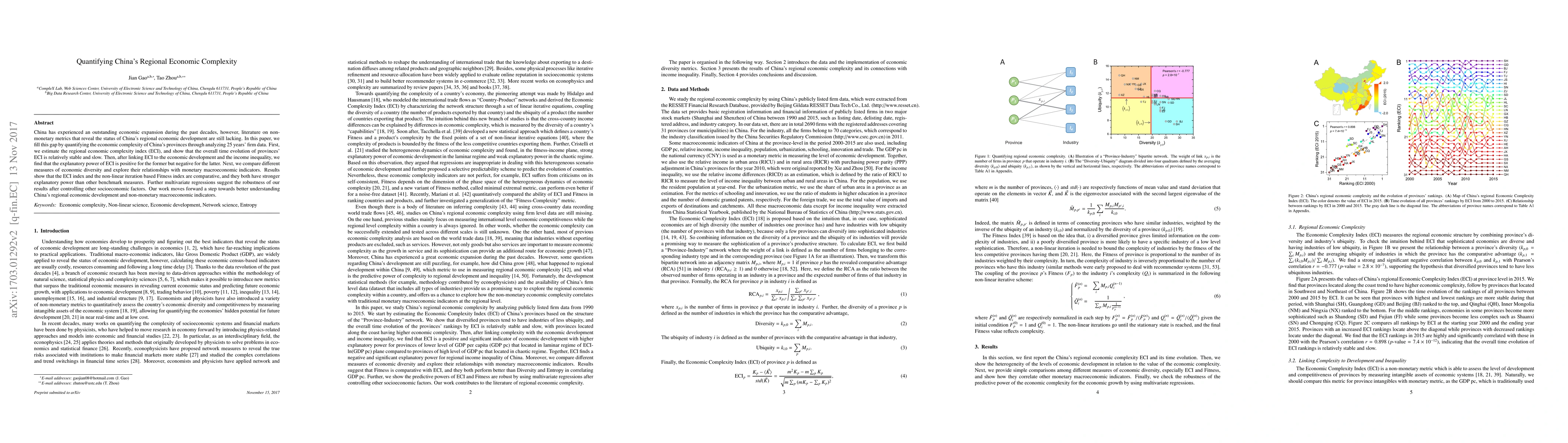 This paper quantifies the economic complexity of China's provinces using a regional economic complexity index (ECI) derived from 25 years of firm data, revealing a stable and slow evolution over time. It finds that ECI positively correlates with economic development but negatively with income inequality, and demonstrates that the ECI and Fitness index are robust measures of economic diversity.
