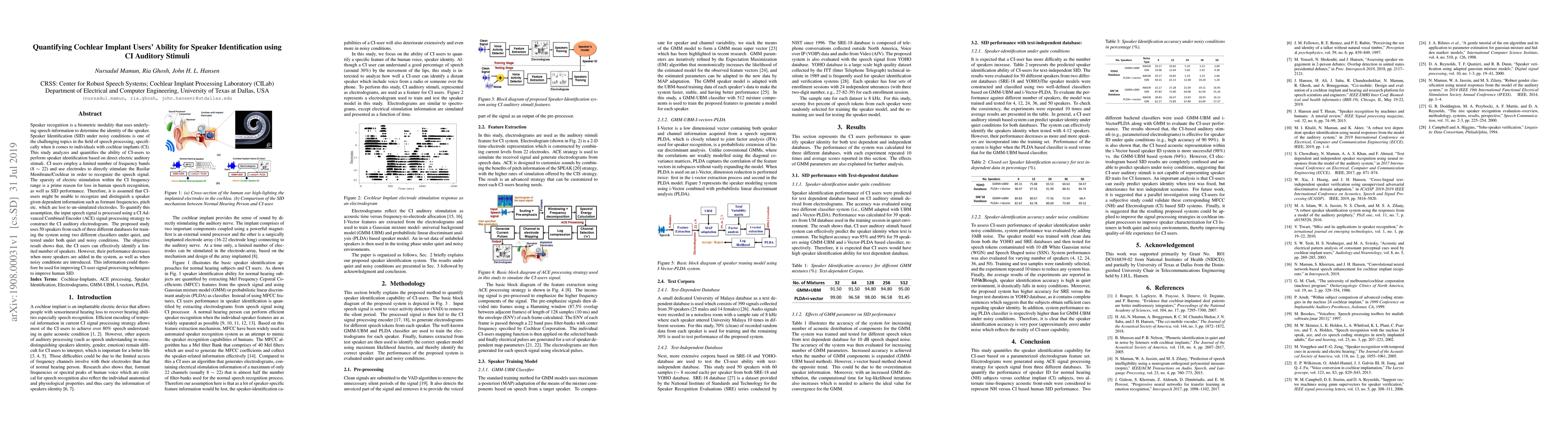 This study quantifies cochlear implant users' ability to perform speaker identification using CI Auditory Stimuli under various conditions. Results show that while CI users can identify a limited number of speakers, their performance declines with more speakers and in noisy environments, suggesting room for improving CI signal processing techniques.