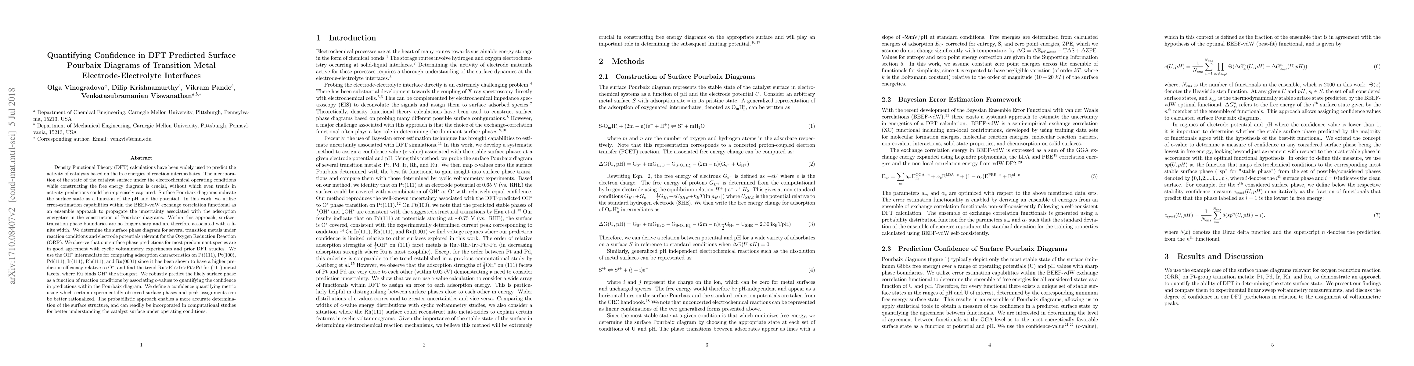 Density Functional Theory (DFT) calculations have been widely used to predict the activity of catalysts based on the free energies of reaction intermediates. The incorporation of the state of the catalyst surface under the electrochemical operating conditions while constructing the free energy diagram is crucial, without which even trends in activity predictions could be imprecisely captured. Surface Pourbaix diagrams indicate the surface state as a function of the pH and the potential. In this work, we utilize error-estimation capabilities within the BEEF-vdW exchange correlation functional as an ensemble approach to propagate the uncertainty associated with the adsorption energetics in the construction of Pourbaix diagrams. Within this approach, surface-transition phase boundaries are no longer sharp and are therefore associated with a finite width. We determine the surface phase diagram for several transition metals under reaction conditions and electrode potentials relevant for the Oxygen Reduction Reaction (ORR). We observe that our surface phase predictions for most predominant species are in good agreement with cyclic voltammetry experiments and prior DFT studies. We use the OH$^*$ intermediate for comparing adsorption characteristics on Pt(111), Pt(100), Pd(111), Ir(111), Rh(111), and Ru(0001) since it has been shown to have a higher prediction efficiency relative to O$^*$, and find the trend Ru>Rh>Ir>Pt>Pd for (111) metal facets, where Ru binds OH$^*$ the strongest. We robustly predict the likely surface phase as a function of reaction conditions by associating c-values to quantifying the confidence in predictions within the Pourbaix diagram. We define a confidence quantifying metric using which certain experimentally observed surface phases and peak assignments can be better rationalized.