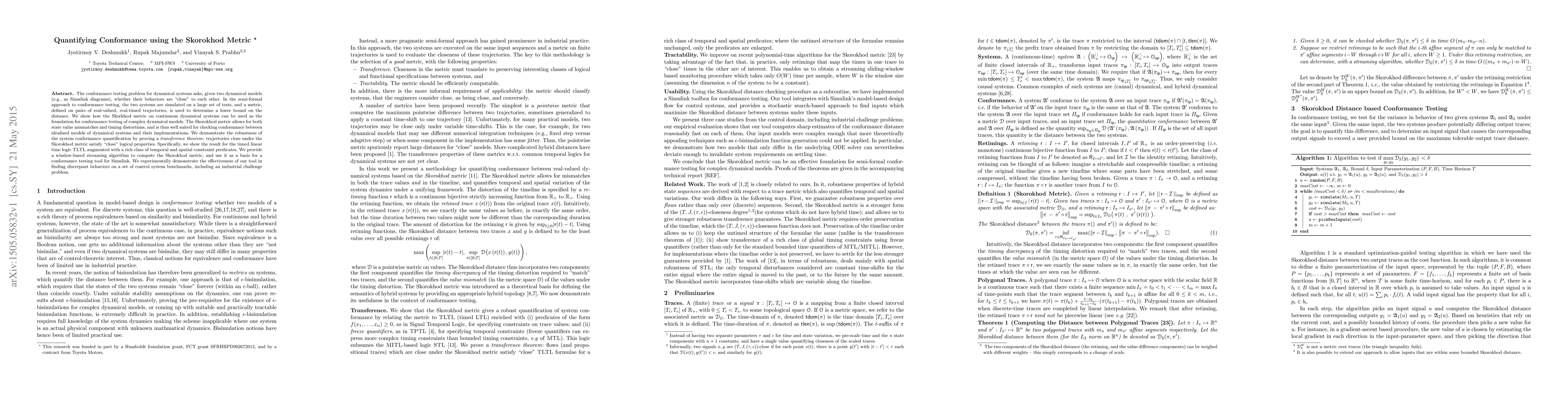 The conformance testing problem for dynamical systems asks, given two dynamical models (e.g., as Simulink diagrams), whether their behaviors are "close" to each other. In the semi-formal approach to conformance testing, the two systems are simulated on a large set of tests, and a metric, defined on pairs of real-valued, real-timed trajectories, is used to determine a lower bound on the distance. We show how the Skorkhod metric on continuous dynamical systems can be used as the foundation for conformance testing of complex dynamical models. The Skorokhod metric allows for both state value mismatches and timing distortions, and is thus well suited for checking conformance between idealized models of dynamical systems and their implementations. We demonstrate the robustness of the system conformance quantification by proving a \emph{transference theorem}: trajectories close under the Skorokhod metric satisfy "close" logical properties. Specifically, we show the result for the timed linear time logic \TLTL augmented with a rich class of temporal and spatial constraint predicates. We provide a window-based streaming algorithm to compute the Skorokhod metric, and use it as a basis for a conformance testing tool for Simulink. We experimentally demonstrate the effectiveness of our tool in finding discrepant behaviors on a set of control system benchmarks, including an industrial challenge problem.