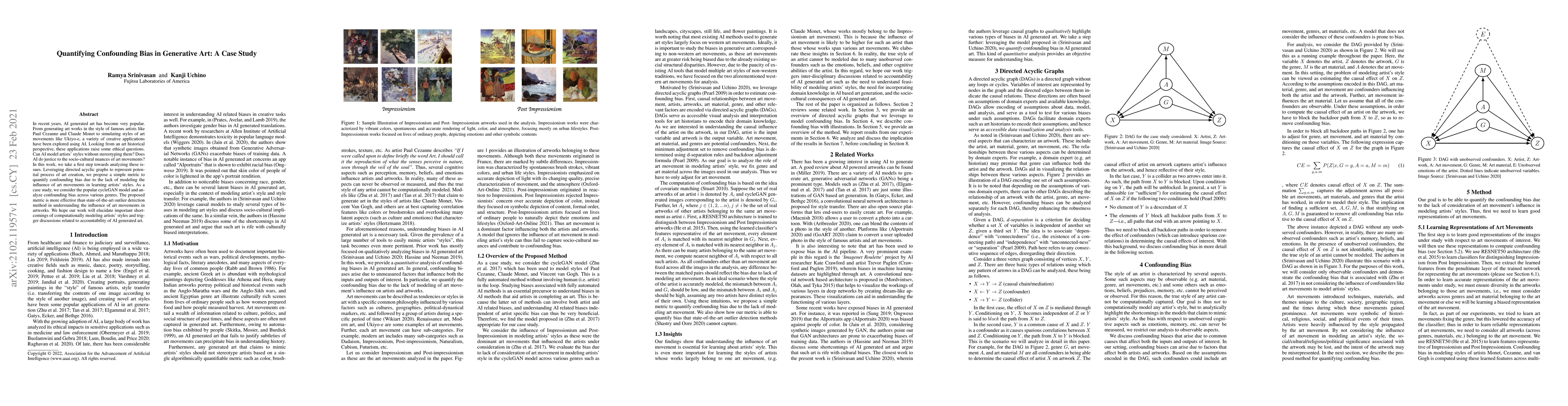 In recent years, AI generated art has become very popular. From generating art works in the style of famous artists like Paul Cezanne and Claude Monet to simulating styles of art movements like Ukiyo-e, a variety of creative applications have been explored using AI. Looking from an art historical perspective, these applications raise some ethical questions. Can AI model artists' styles without stereotyping them? Does AI do justice to the socio-cultural nuances of art movements? In this work, we take a first step towards analyzing these issues. Leveraging directed acyclic graphs to represent potential process of art creation, we propose a simple metric to quantify confounding bias due to the lack of modeling the influence of art movements in learning artists' styles. As a case study, we consider the popular cycleGAN model and analyze confounding bias across various genres. The proposed metric is more effective than state-of-the-art outlier detection method in understanding the influence of art movements in artworks. We hope our work will elucidate important shortcomings of computationally modeling artists' styles and trigger discussions related to accountability of AI generated art.