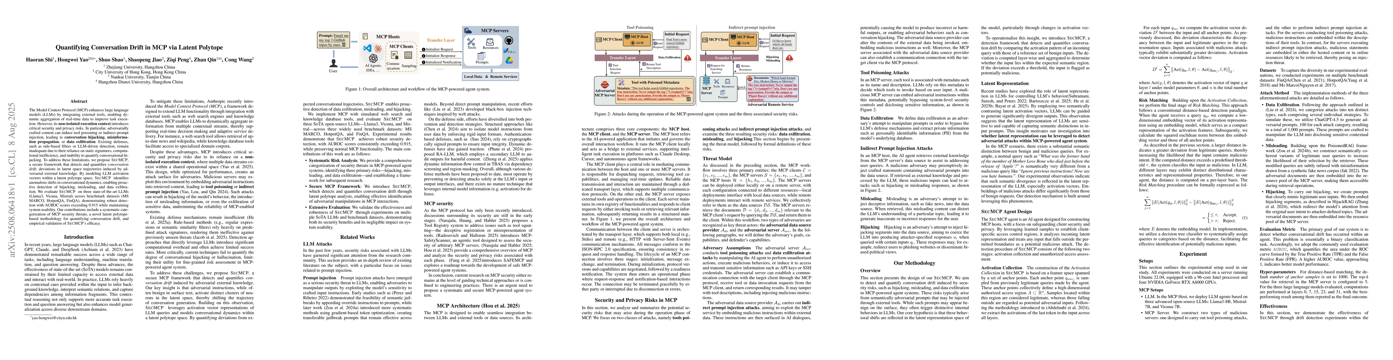 The Model Context Protocol (MCP) enhances large language models (LLMs) by integrating external tools, enabling dynamic aggregation of real-time data to improve task execution. However, its non-isolated execution context introduces critical security and privacy risks. In particular, adversarially crafted content can induce tool poisoning or indirect prompt injection, leading to conversation hijacking, misinformation propagation, or data exfiltration. Existing defenses, such as rule-based filters or LLM-driven detection, remain inadequate due to their reliance on static signatures, computational inefficiency, and inability to quantify conversational hijacking. To address these limitations, we propose SecMCP, a secure framework that detects and quantifies conversation drift, deviations in latent space trajectories induced by adversarial external knowledge. By modeling LLM activation vectors within a latent polytope space, SecMCP identifies anomalous shifts in conversational dynamics, enabling proactive detection of hijacking, misleading, and data exfiltration. We evaluate SecMCP on three state-of-the-art LLMs (Llama3, Vicuna, Mistral) across benchmark datasets (MS MARCO, HotpotQA, FinQA), demonstrating robust detection with AUROC scores exceeding 0.915 while maintaining system usability. Our contributions include a systematic categorization of MCP security threats, a novel latent polytope-based methodology for quantifying conversation drift, and empirical validation of SecMCP's efficacy.