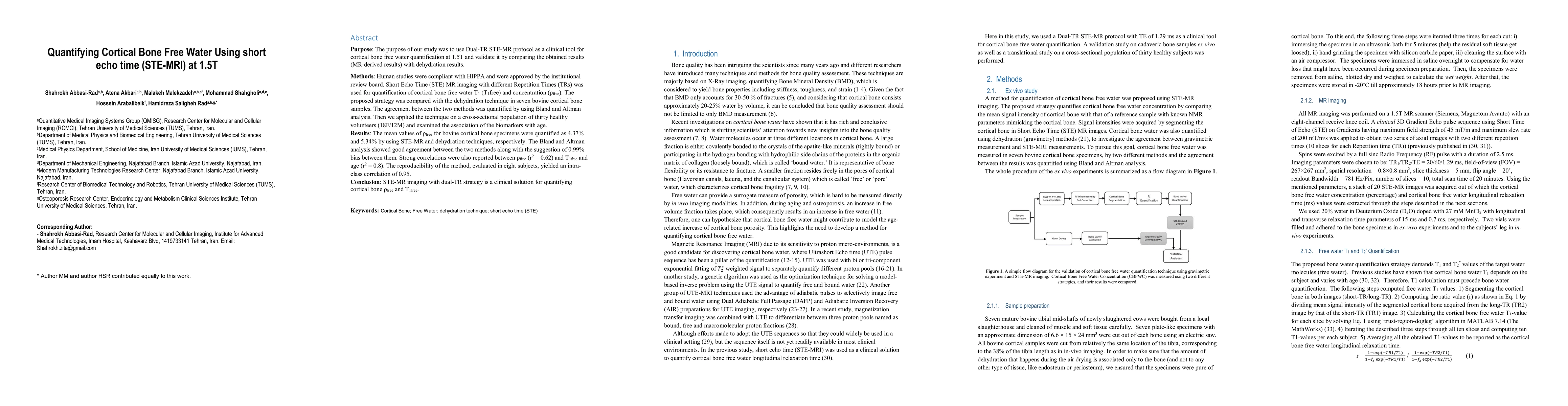Researchers developed a new imaging technique to measure cortical bone water content using MRI at 1.5T, with results showing good agreement between the method and dehydration techniques.