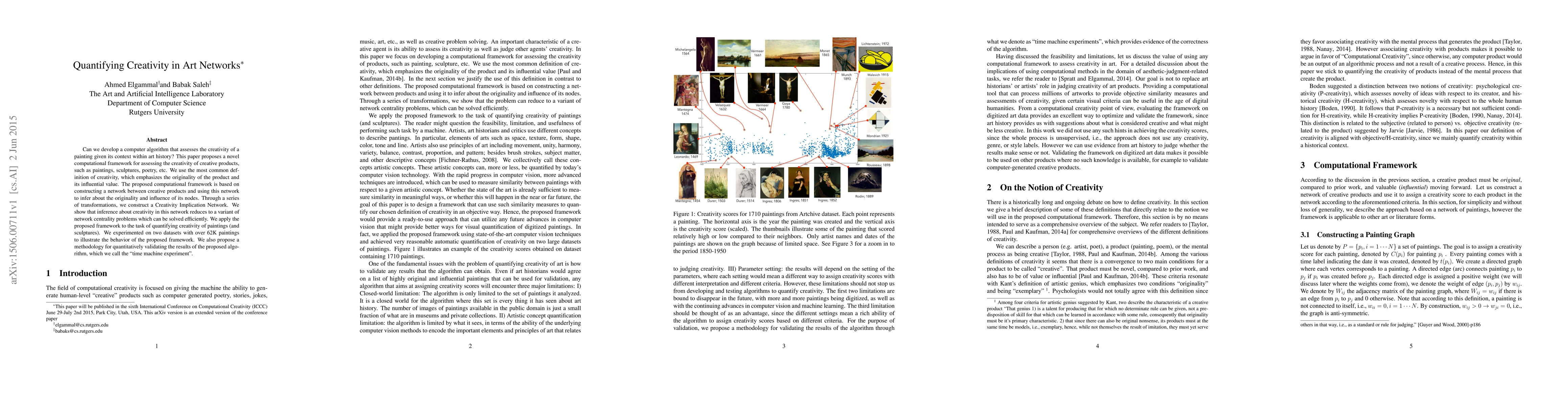 Can we develop a computer algorithm that assesses the creativity of a painting given its context within art history? This paper proposes a novel computational framework for assessing the creativity of creative products, such as paintings, sculptures, poetry, etc. We use the most common definition of creativity, which emphasizes the originality of the product and its influential value. The proposed computational framework is based on constructing a network between creative products and using this network to infer about the originality and influence of its nodes. Through a series of transformations, we construct a Creativity Implication Network. We show that inference about creativity in this network reduces to a variant of network centrality problems which can be solved efficiently. We apply the proposed framework to the task of quantifying creativity of paintings (and sculptures). We experimented on two datasets with over 62K paintings to illustrate the behavior of the proposed framework. We also propose a methodology for quantitatively validating the results of the proposed algorithm, which we call the "time machine experiment".