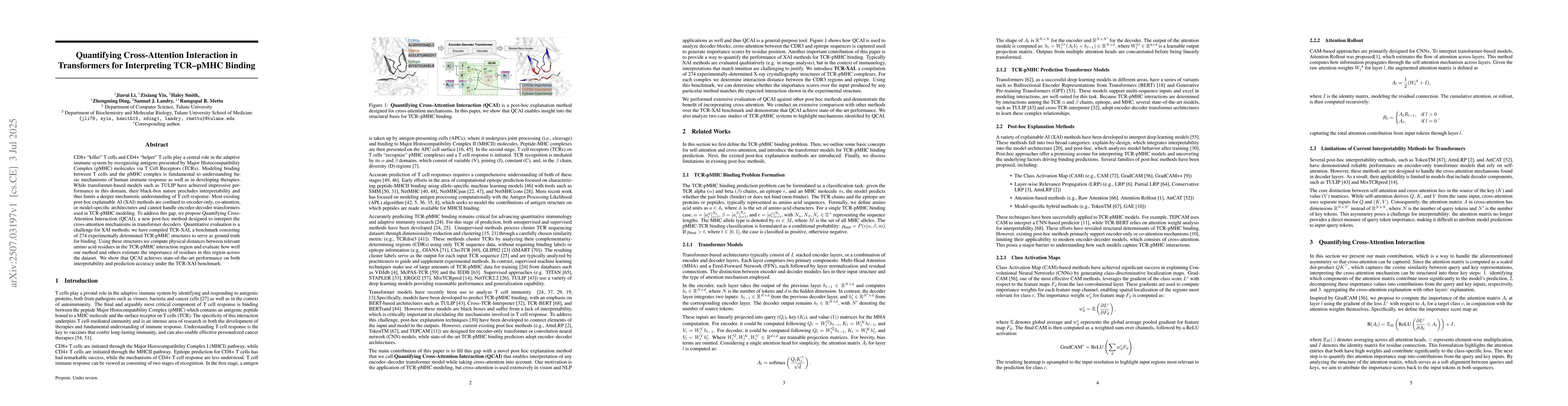 CD8+ "killer" T cells and CD4+ "helper" T cells play a central role in the adaptive immune system by recognizing antigens presented by Major Histocompatibility Complex (pMHC) molecules via T Cell Receptors (TCRs). Modeling binding between T cells and the pMHC complex is fundamental to understanding basic mechanisms of human immune response as well as in developing therapies. While transformer-based models such as TULIP have achieved impressive performance in this domain, their black-box nature precludes interpretability and thus limits a deeper mechanistic understanding of T cell response. Most existing post-hoc explainable AI (XAI) methods are confined to encoder-only, co-attention, or model-specific architectures and cannot handle encoder-decoder transformers used in TCR-pMHC modeling. To address this gap, we propose Quantifying Cross-Attention Interaction (QCAI), a new post-hoc method designed to interpret the cross-attention mechanisms in transformer decoders. Quantitative evaluation is a challenge for XAI methods; we have compiled TCR-XAI, a benchmark consisting of 274 experimentally determined TCR-pMHC structures to serve as ground truth for binding. Using these structures we compute physical distances between relevant amino acid residues in the TCR-pMHC interaction region and evaluate how well our method and others estimate the importance of residues in this region across the dataset. We show that QCAI achieves state-of-the-art performance on both interpretability and prediction accuracy under the TCR-XAI benchmark.