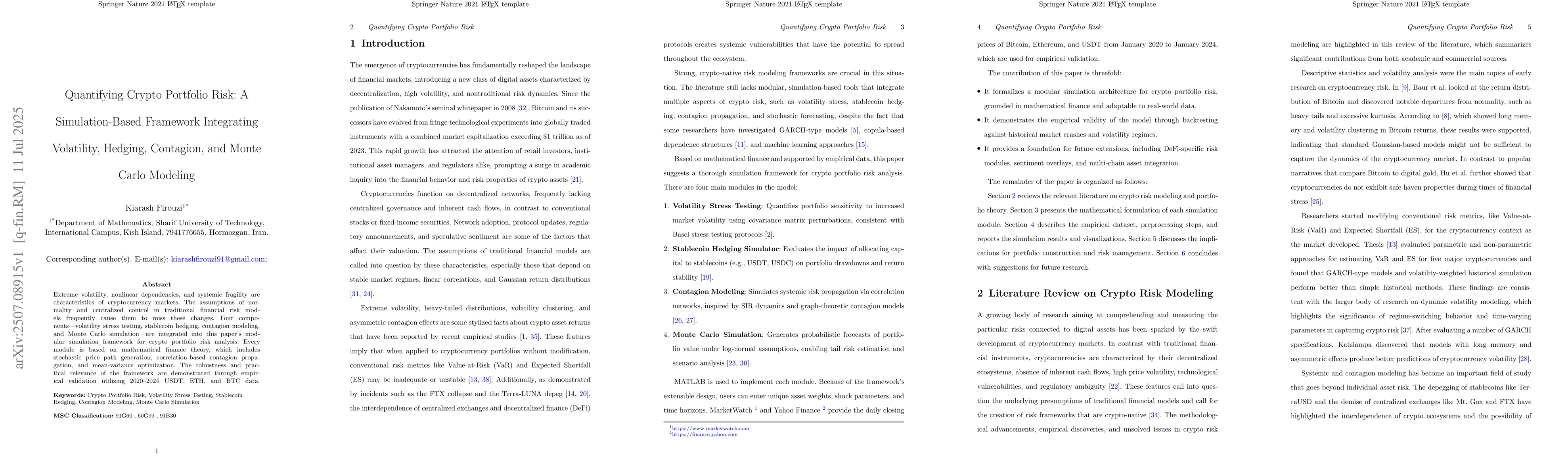 Extreme volatility, nonlinear dependencies, and systemic fragility are characteristics of cryptocurrency markets. The assumptions of normality and centralized control in traditional financial risk models frequently cause them to miss these changes. Four components-volatility stress testing, stablecoin hedging, contagion modeling, and Monte Carlo simulation-are integrated into this paper's modular simulation framework for crypto portfolio risk analysis. Every module is based on mathematical finance theory, which includes stochastic price path generation, correlation-based contagion propagation, and mean-variance optimization. The robustness and practical relevance of the framework are demonstrated through empirical validation utilizing 2020-2024 USDT, ETH, and BTC data.