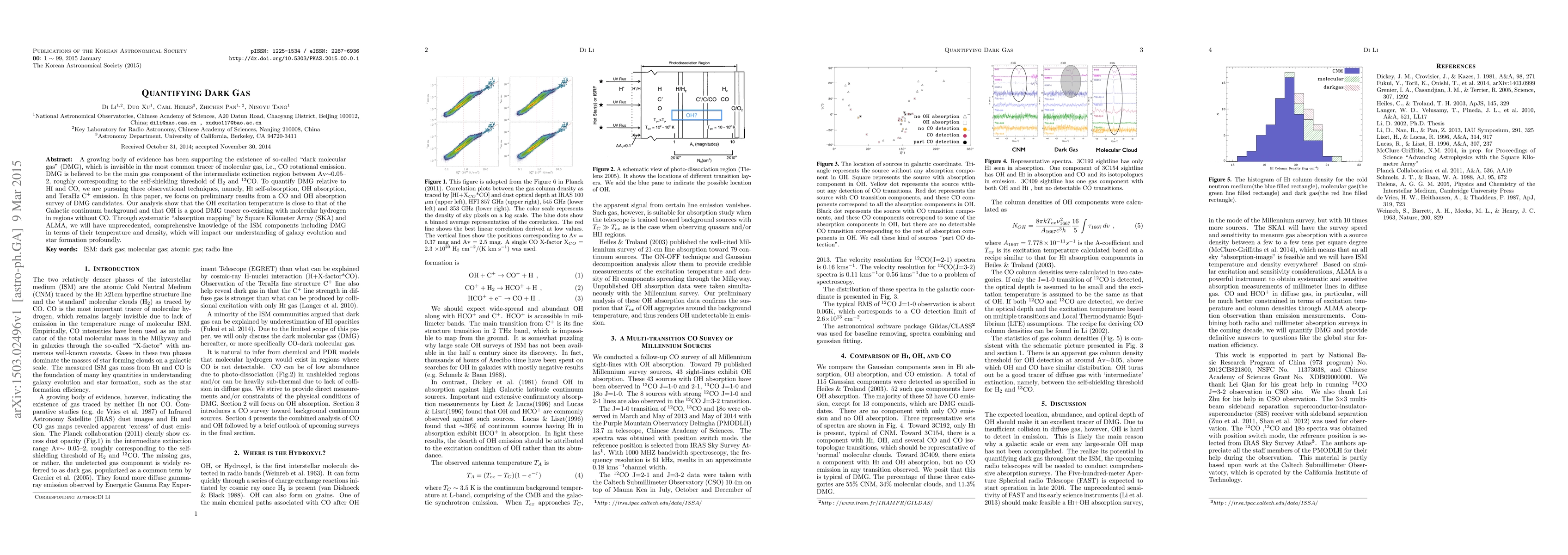 A growing body of evidence has been supporting the existence of so-called "dark molecular gas" (DMG), which is invisible in the most common tracer of molecular gas, i.e., CO rotational emission. DMG is believed to be the main gas component of the intermediate extinction region between A$\rm_v$$\sim$0.05-2, roughly corresponding to the self-shielding threshold of H$_2$ and $^{13}$CO. To quantify DMG relative to HI and CO, we are pursuing three observational techniques, namely, HI self-absorption, OH absorption, and TeraHz C$^+$ emission. In this paper, we focus on preliminary results from a CO and OH absorption survey of DMG candidates. Our analysis show that the OH excitation temperature is close to that of the Galactic continuum background and that OH is a good DMG tracer co-existing with molecular hydrogen in regions without CO. Through systematic "absorption mapping" by Square Kilometer Array (SKA) and ALMA, we will have unprecedented, comprehensive knowledge of the ISM components including DMG in terms of their temperature and density, which will impact our understanding of galaxy evolution and star formation profoundly.