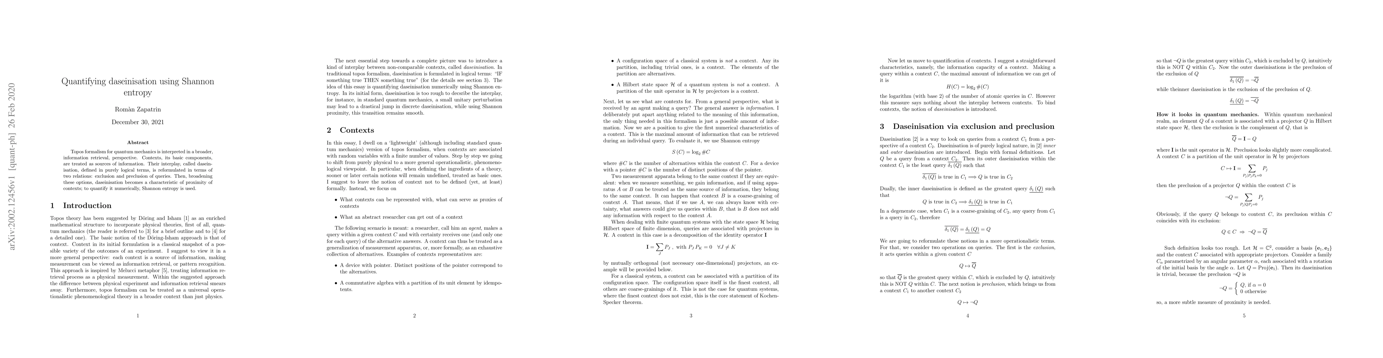 The paper reformulates daseinisation in topos quantum mechanics using logical relations of exclusion and preclusion, then quantifies it numerically using Shannon entropy to measure the proximity of contexts. Shannon entropy provides a metric for the information-theoretic interplay between contexts.