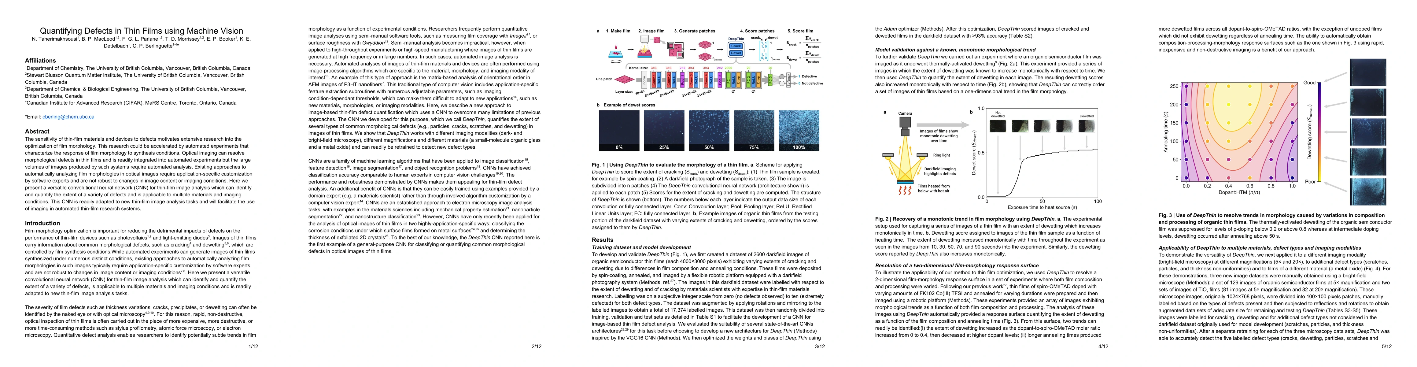The sensitivity of thin-film materials and devices to defects motivates extensive research into the optimization of film morphology. This research could be accelerated by automated experiments that characterize the response of film morphology to synthesis conditions. Optical imaging can resolve morphological defects in thin films and is readily integrated into automated experiments but the large volumes of images produced by such systems require automated analysis. Existing approaches to automatically analyzing film morphologies in optical images require application-specific customization by software experts and are not robust to changes in image content or imaging conditions. Here we present a versatile convolutional neural network (CNN) for thin-film image analysis which can identify and quantify the extent of a variety of defects and is applicable to multiple materials and imaging conditions. This CNN is readily adapted to new thin-film image analysis tasks and will facilitate the use of imaging in automated thin-film research systems.