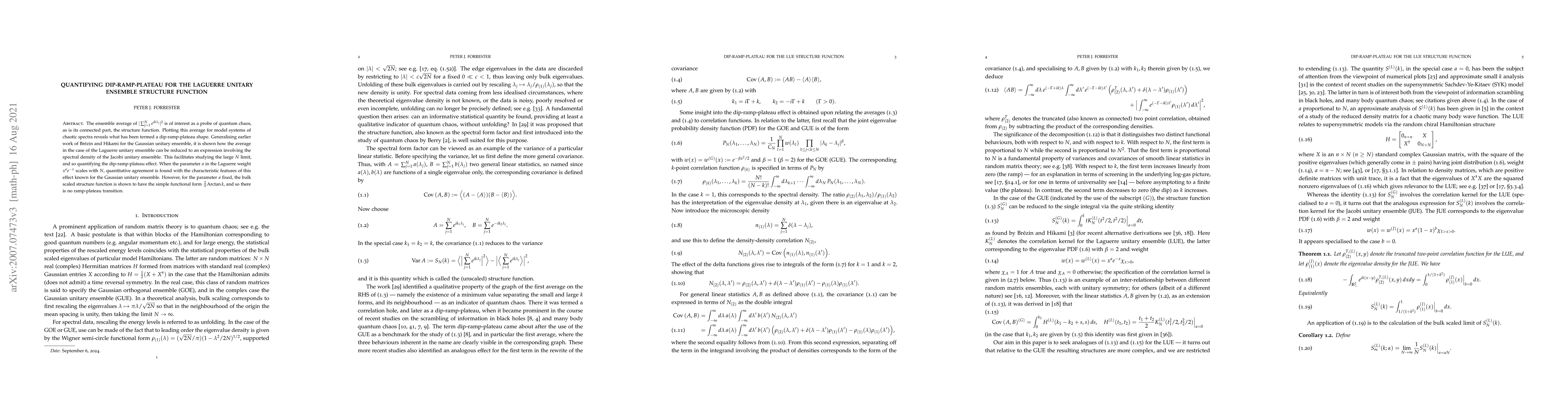 The ensemble average of $| \sum_{j=1}^N e^{i k \lambda_j} |^2$ is of interest as a probe of quantum chaos, as is its connected part, the structure function. Plotting this average for model systems of chaotic spectra reveals what has been termed a dip-ramp-plateau shape. Generalising earlier work of Br\'ezin and Hikami for the Gaussian unitary ensemble, it is shown how the average in the case of the Laguerre unitary ensemble can be reduced to an expression involving the spectral density of the Jacobi unitary ensemble. This facilitates studying the large $N$ limit, and so quantifying the dip-ramp-plateau effect. When the parameter $a$ in the Laguerre weight $x^a e^{-x}$ scales with $N$, quantitative agreement is found with the characteristic features of this effect known for the Gaussian unitary ensemble. However, for the parameter $a$ fixed, the bulk scaled structure function is shown to have the simple functional form ${2 \over \pi} {\rm Arctan} \, k$, and so there is no ramp-plateau transition.