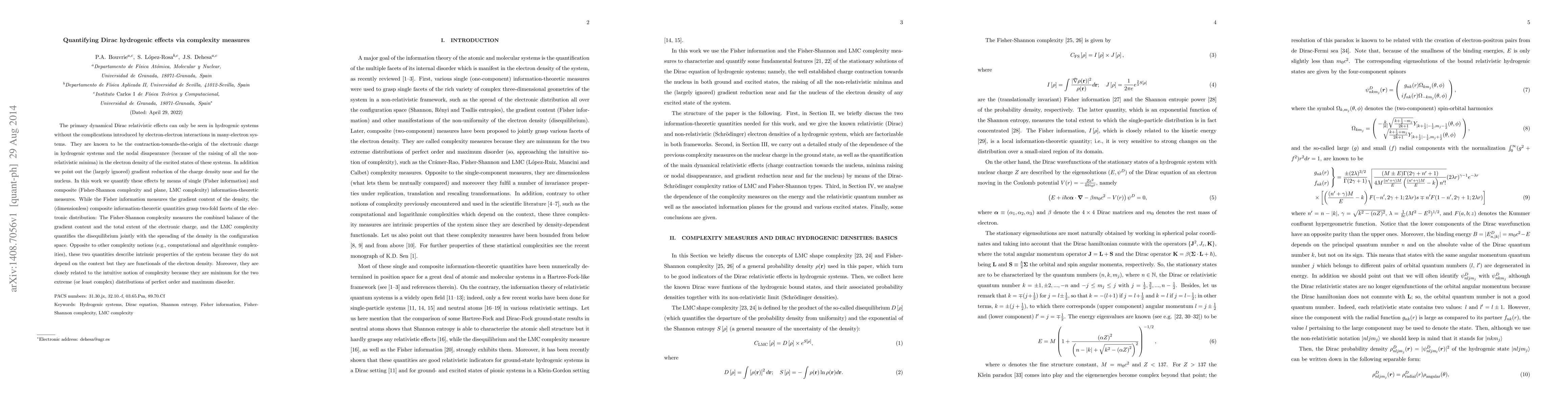 This paper quantifies Dirac relativistic effects in hydrogenic systems using information-theoretic measures, including Fisher information, Fisher-Shannon complexity, and LMC complexity. These measures capture the gradient content, balance of gradient and charge distribution, and disequilibrium of electronic density, respectively, providing intrinsic insights into hydrogenic systems.