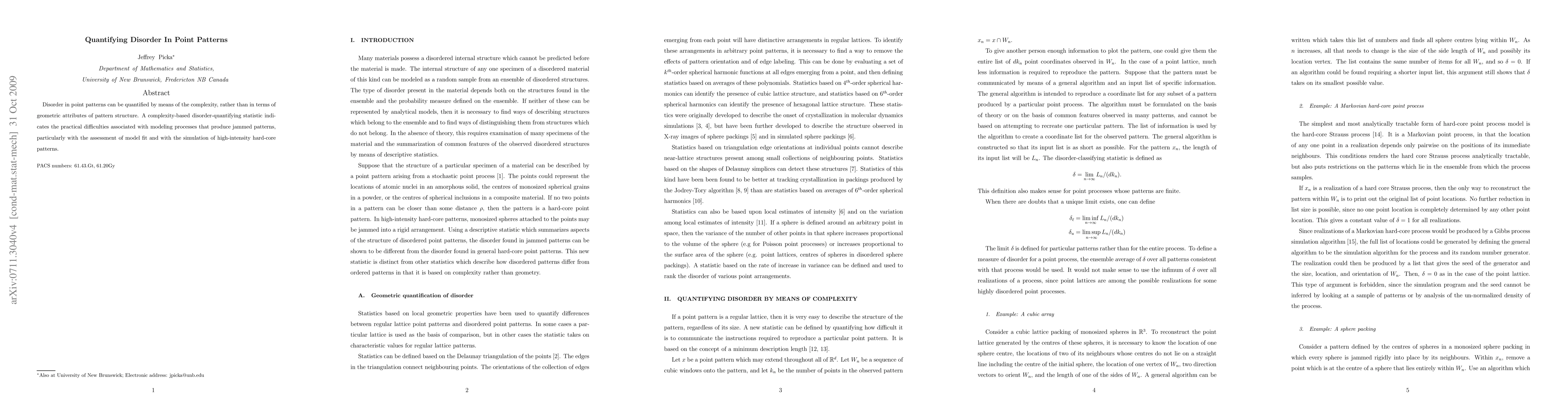 This paper proposes a complexity-based statistic to quantify disorder in point patterns, emphasizing practical challenges in modeling jammed patterns and assessing model fit, particularly for high-intensity hard-core patterns. The approach focuses on complexity rather than geometric attributes for a more effective disorder quantification.