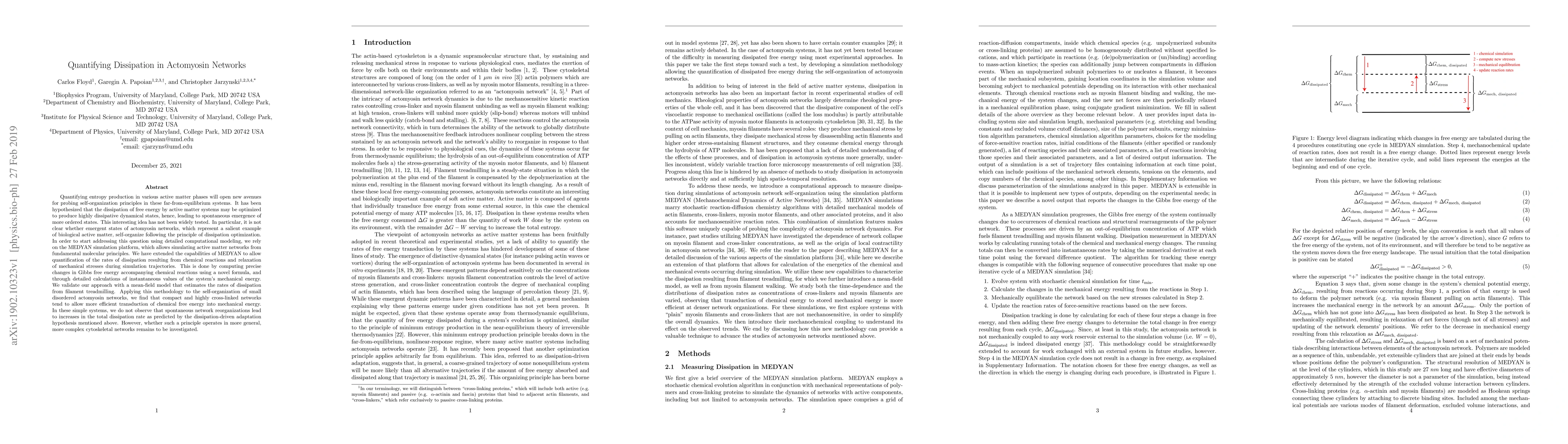 Quantifying entropy production in various active matter phases will open new avenues for probing self-organization principles in these far-from-equilibrium systems. It has been hypothesized that the dissipation of free energy by active matter systems may be optimized to produce highly dissipative dynamical states, hence, leading to spontaneous emergence of more ordered states. This interesting idea has not been widely tested. In particular, it is not clear whether emergent states of actomyosin networks, which represent a salient example of biological active matter, self-organize following the principle of dissipation optimization. In order to start addressing this question using detailed computational modeling, we rely on the MEDYAN simulation platform, which allows simulating active matter networks from fundamental molecular principles. We have extended the capabilities of MEDYAN to allow quantification of the rates of dissipation resulting from chemical reactions and relaxation of mechanical stresses during simulation trajectories. We validate our approach with a mean-field model that estimates the rates of dissipation from filament treadmilling. Applying this methodology to the self-organization of small disordered actomyosin networks, we find that compact and highly cross-linked networks tend to allow more efficient transduction of chemical free energy into mechanical energy. In these simple systems, we do not observe that spontaneous network reorganizations lead to increases in the total dissipation rate as predicted by the dissipation-driven adaptation hypothesis mentioned above. However, whether such a principle operates in more general, more complex cytoskeletal networks remains to be investigated.