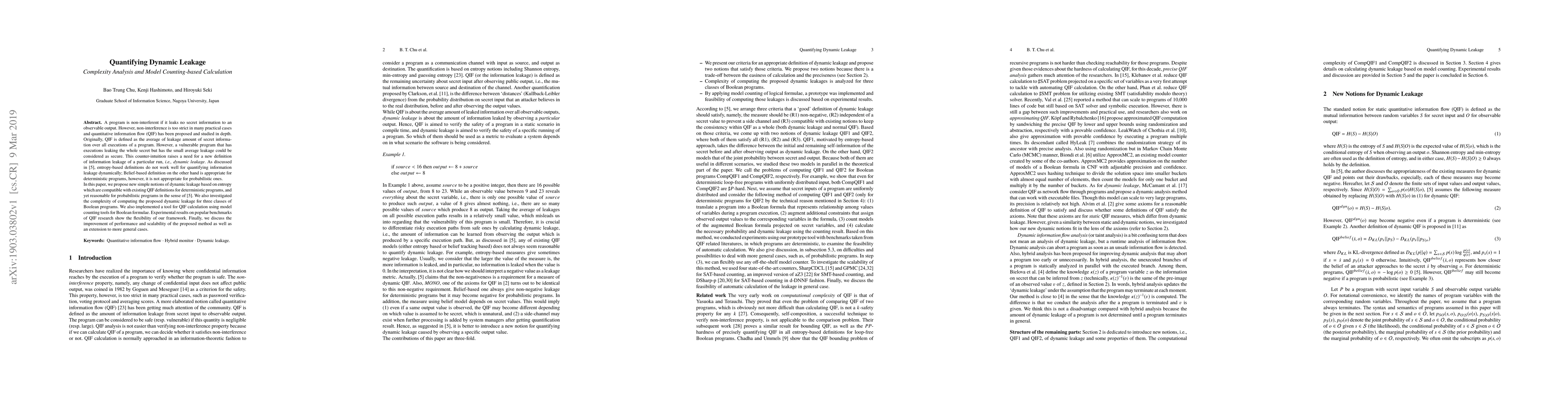 This paper proposes new dynamic leakage definitions based on entropy for quantifying information leakage in both deterministic and probabilistic programs, addressing the limitations of existing quantitative information flow (QIF) measures. It also investigates the computational complexity of these definitions and presents a tool for QIF calculation using model counting, demonstrating its effectiveness through benchmark experiments.