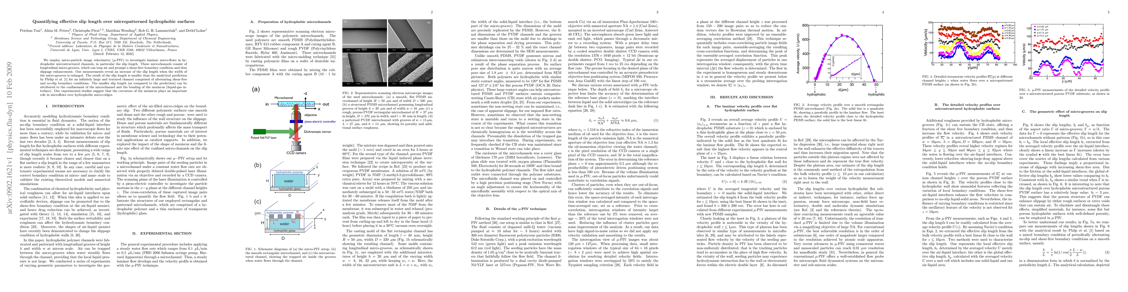 This paper uses micro-particle image velocimetry to measure slip length in laminar micro-flows over hydrophobic micro-grooved channels, finding an increased slip length with wider grooves. However, the measured slip length is smaller than predicted by existing models, likely due to microchannel confinement and meniscus curvature effects.