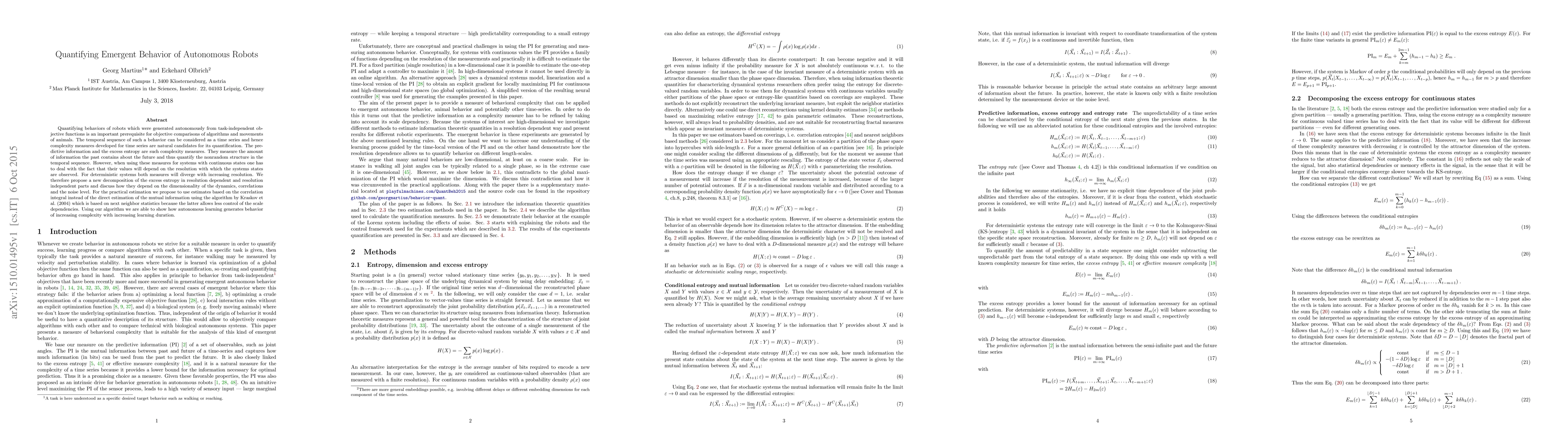 Quantifying behaviors of robots which were generated autonomously from task-independent objective functions is an important prerequisite for objective comparisons of algorithms and movements of animals. The temporal sequence of such a behavior can be considered as a time series and hence complexity measures developed for time series are natural candidates for its quantification. The predictive information and the excess entropy are such complexity measures. They measure the amount of information the past contains about the future and thus quantify the nonrandom structure in the temporal sequence. However, when using these measures for systems with continuous states one has to deal with the fact that their values will depend on the resolution with which the systems states are observed. For deterministic systems both measures will diverge with increasing resolution. We therefore propose a new decomposition of the excess entropy in resolution dependent and resolution independent parts and discuss how they depend on the dimensionality of the dynamics, correlations and the noise level. For the practical estimation we propose to use estimates based on the correlation integral instead of the direct estimation of the mutual information using the algorithm by Kraskov et al. (2004) which is based on next neighbor statistics because the latter allows less control of the scale dependencies. Using our algorithm we are able to show how autonomous learning generates behavior of increasing complexity with increasing learning duration.