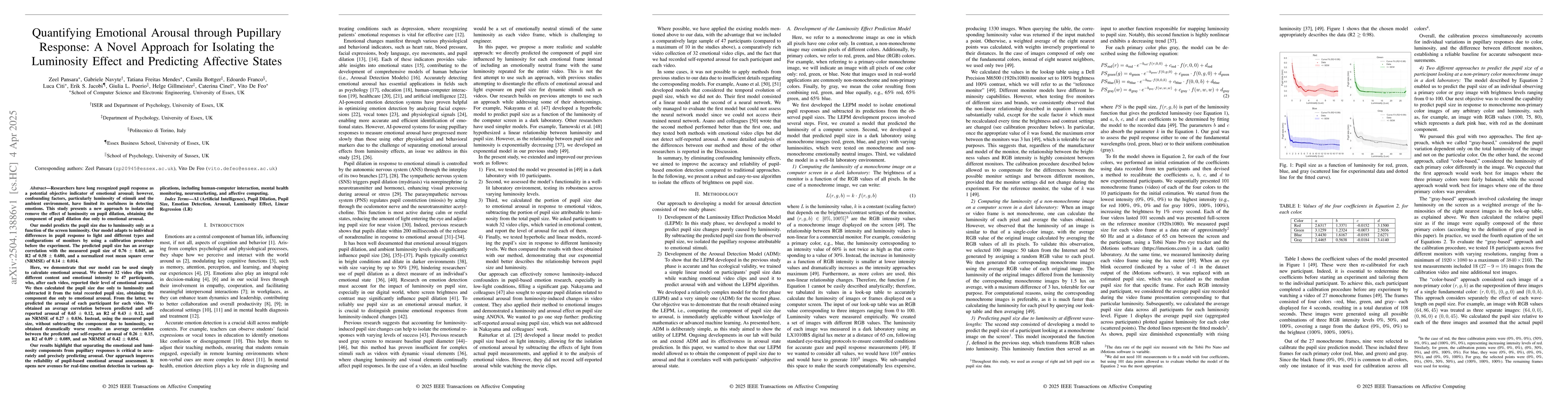 The development of a model capable of isolating the luminosity effect from pupillary responses to accurately predict emotional arousal.