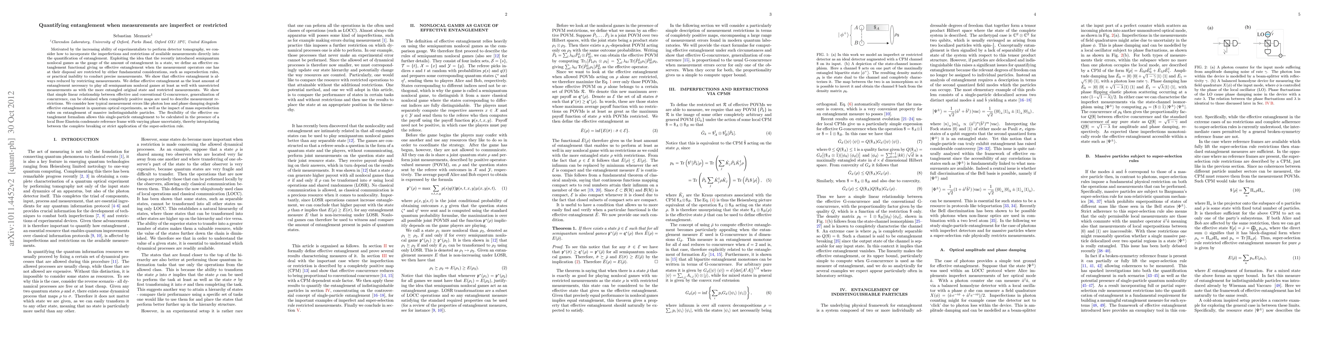 Motivated by the increasing ability of experimentalists to perform detector tomography, we consider how to incorporate the imperfections and restrictions of available measurements directly into the quantification of entanglement. Exploiting the idea that the recently introduced semiquantum nonlocal games as the gauge of the amount of entanglement in a state, we define an effective entanglement functional giving us effective entanglement when the measurement operators one has at their disposal are restricted by either fundamental considerations, such as superselection rules, or practical inability to conduct precise measurements. We show that effective entanglement is always reduced by restricting measurements. We define effective entanglement as the least amount of entanglement necessary to play all semiquantum nonlocal games at least as well with unrestricted measurements as with the more entangled original state and restricted measurements. We show that simple linear relationship between effective and conventional G-concurrence, generalization of concurrence, can be obtained when completely positive maps are used to describe measurement restrictions. We consider how typical measurement errors like photon loss and phase damping degrade effective entanglement in quantum optical experiments, as well as the impact of mass superselection rules on entanglement of massive indistinguishable particles. The flexibility of the effective entanglement formalism allows this single-particle entanglement to be calculated in the presence of a local Bose Einstein condensate reference frame with varying phase uncertainty, thereby interpolating between the complete breaking or strict application of the super-selection rule.