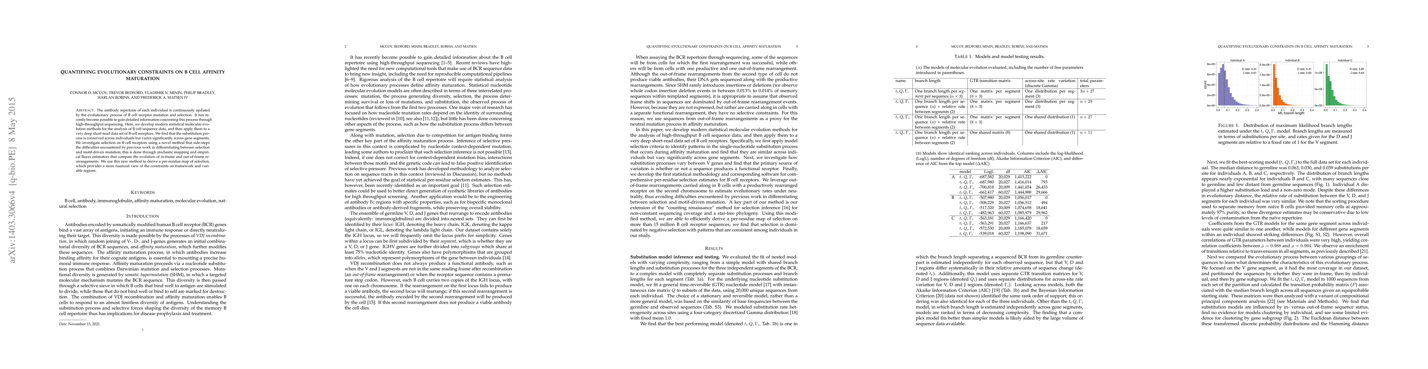 The antibody repertoire of each individual is continuously updated by the evolutionary process of B cell receptor mutation and selection. It has recently become possible to gain detailed information concerning this process through high-throughput sequencing. Here, we develop modern statistical molecular evolution methods for the analysis of B cell sequence data, and then apply them to a very deep short-read data set of B cell receptors. We find that the substitution process is conserved across individuals but varies significantly across gene segments. We investigate selection on B cell receptors using a novel method that side-steps the difficulties encountered by previous work in differentiating between selection and motif-driven mutation; this is done through stochastic mapping and empirical Bayes estimators that compare the evolution of in-frame and out-of-frame rearrangements. We use this new method to derive a per-residue map of selection, which provides a more nuanced view of the constraints on framework and variable regions.