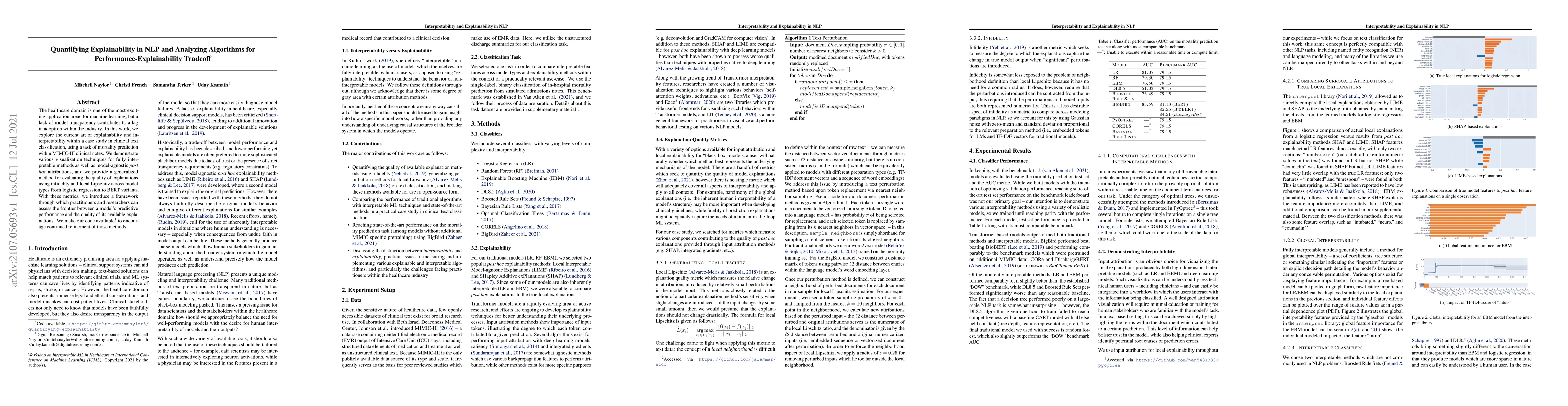 This research paper explores explainability in NLP, introducing a framework to assess performance-explainability tradeoffs using metrics such as infidelity and local Lipschitz. It aims to help practitioners and researchers evaluate the quality of explanations in machine learning models used for clinical text classification tasks.