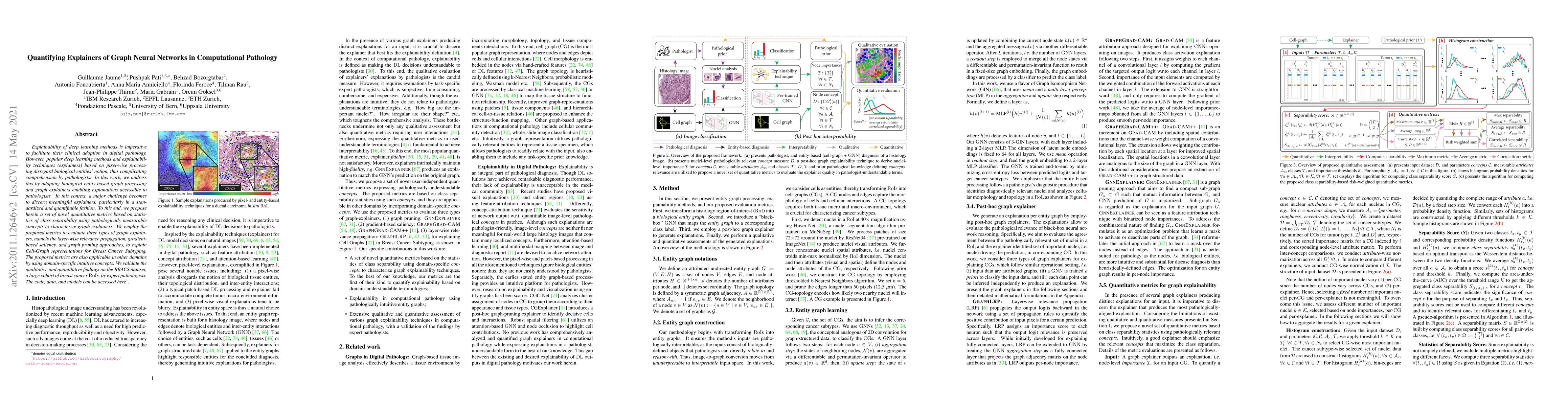 Explainability of deep learning methods is imperative to facilitate their clinical adoption in digital pathology. However, popular deep learning methods and explainability techniques (explainers) based on pixel-wise processing disregard biological entities' notion, thus complicating comprehension by pathologists. In this work, we address this by adopting biological entity-based graph processing and graph explainers enabling explanations accessible to pathologists. In this context, a major challenge becomes to discern meaningful explainers, particularly in a standardized and quantifiable fashion. To this end, we propose herein a set of novel quantitative metrics based on statistics of class separability using pathologically measurable concepts to characterize graph explainers. We employ the proposed metrics to evaluate three types of graph explainers, namely the layer-wise relevance propagation, gradient-based saliency, and graph pruning approaches, to explain Cell-Graph representations for Breast Cancer Subtyping. The proposed metrics are also applicable in other domains by using domain-specific intuitive concepts. We validate the qualitative and quantitative findings on the BRACS dataset, a large cohort of breast cancer RoIs, by expert pathologists.
