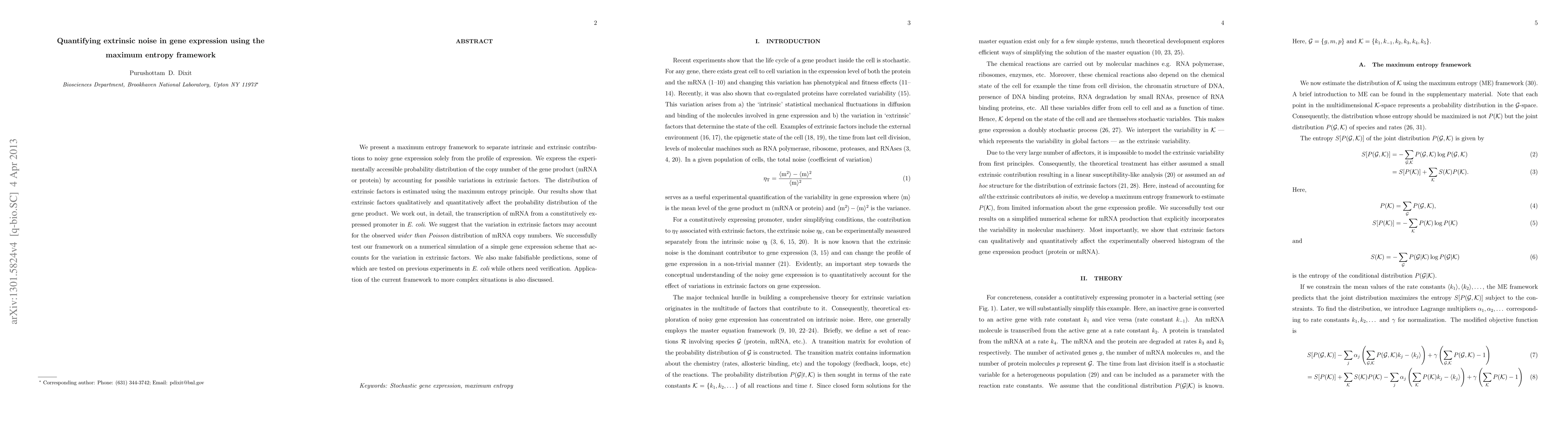 This paper introduces a maximum entropy framework to distinguish intrinsic and extrinsic noise in gene expression, demonstrating its application to mRNA transcription in E. coli. The framework estimates extrinsic factor distributions and suggests that these factors contribute to the observed broader-than-Poisson mRNA copy number distribution.