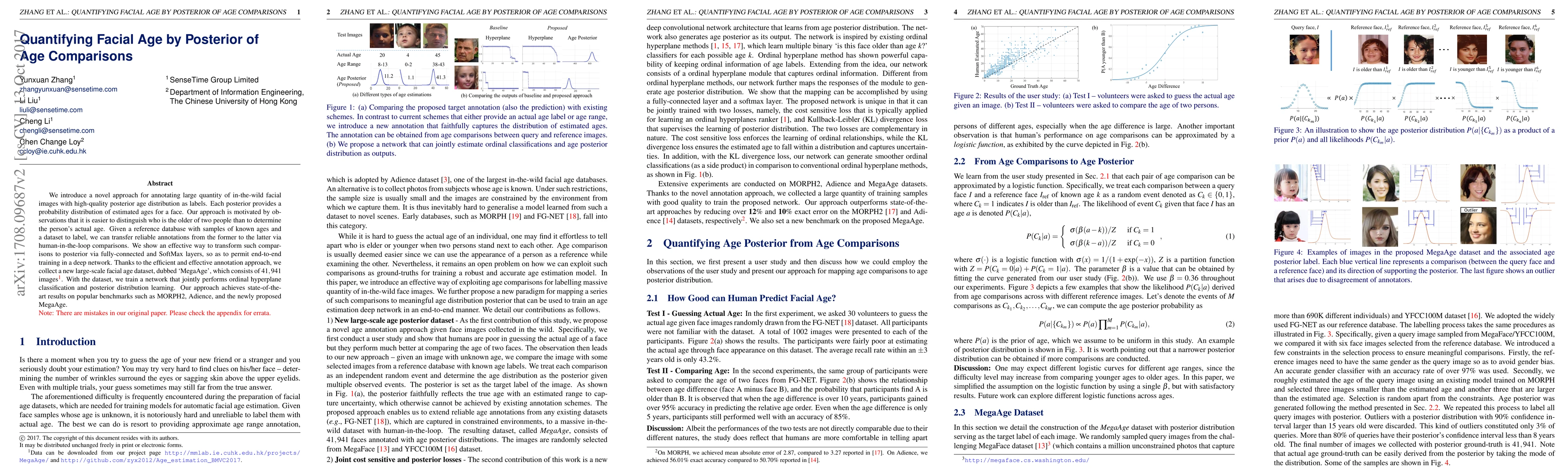 We introduce a novel approach for annotating large quantity of in-the-wild facial images with high-quality posterior age distribution as labels. Each posterior provides a probability distribution of estimated ages for a face. Our approach is motivated by observations that it is easier to distinguish who is the older of two people than to determine the person's actual age. Given a reference database with samples of known ages and a dataset to label, we can transfer reliable annotations from the former to the latter via human-in-the-loop comparisons. We show an effective way to transform such comparisons to posterior via fully-connected and SoftMax layers, so as to permit end-to-end training in a deep network. Thanks to the efficient and effective annotation approach, we collect a new large-scale facial age dataset, dubbed `MegaAge', which consists of 41,941 images. Data can be downloaded from our project page mmlab.ie.cuhk.edu.hk/projects/MegaAge and github.com/zyx2012/Age_estimation_BMVC2017. With the dataset, we train a network that jointly performs ordinal hyperplane classification and posterior distribution learning. Our approach achieves state-of-the-art results on popular benchmarks such as MORPH2, Adience, and the newly proposed MegaAge.