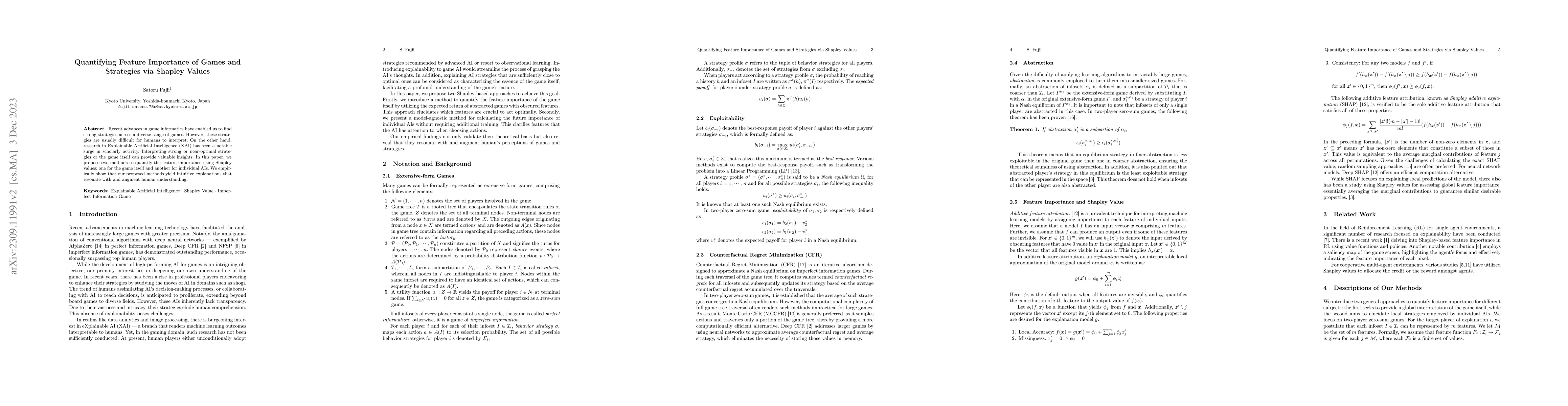 This paper introduces two methods to quantify feature importance in games using Shapley values, aiming to interpret strong strategies in game informatics. The proposed methods provide intuitive explanations that enhance human understanding of both the game and individual AI strategies.