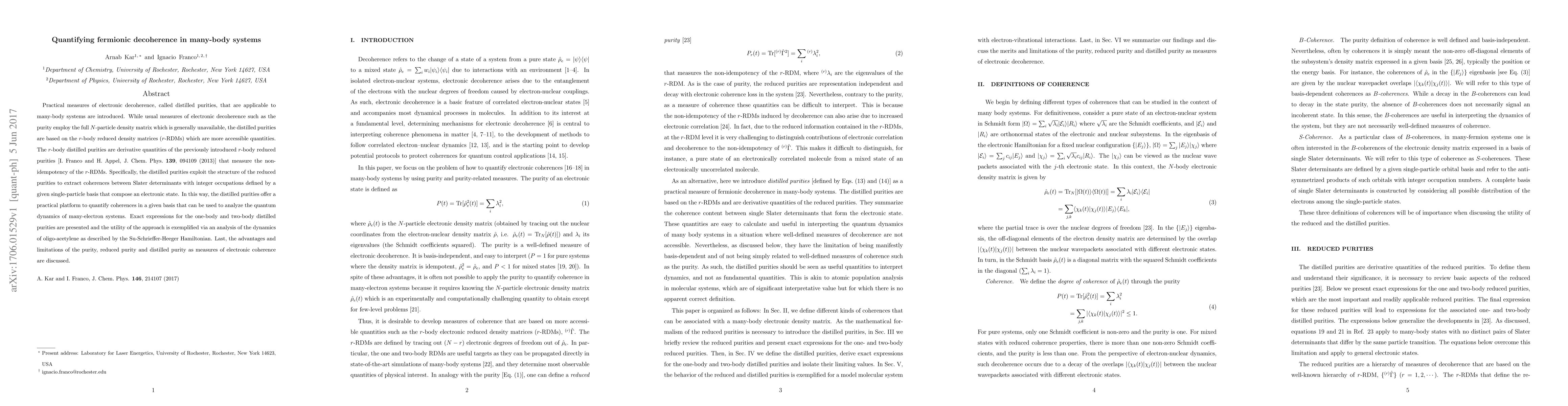 This paper introduces distilled purities as practical measures of fermionic decoherence in many-body systems, based on accessible $r$-body reduced density matrices rather than the full $N$-particle density matrix. The exact expressions for one-body and two-body distilled purities are presented, demonstrating their utility in analyzing quantum dynamics, as exemplified by oligo-acetylene dynamics.