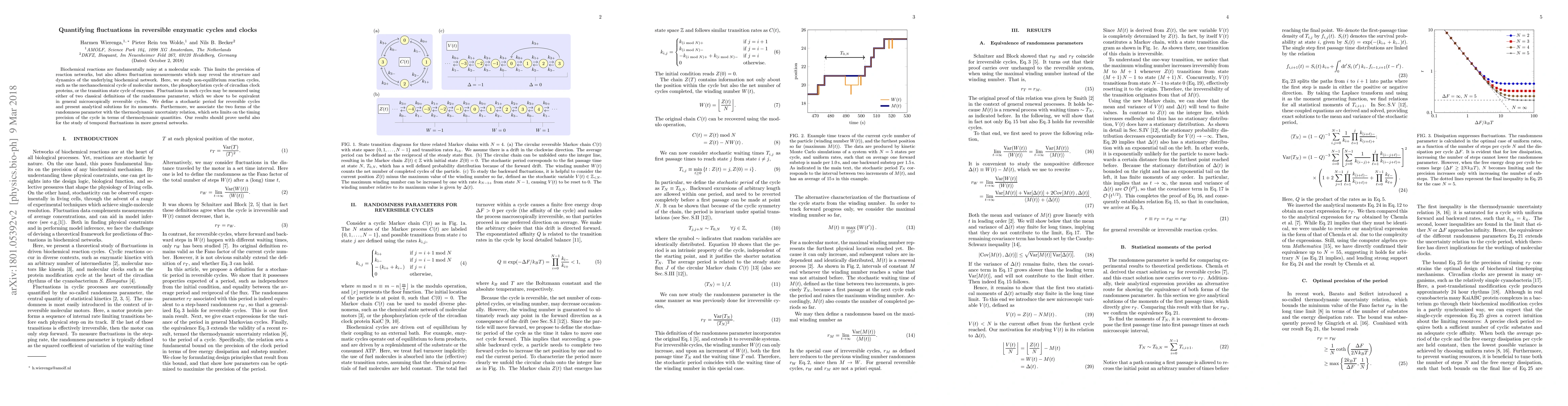 This paper quantifies fluctuations in reversible enzymatic cycles and clocks, demonstrating that two classical definitions of randomness are equivalent in microscopically reversible cycles. It introduces a stochastic period for such cycles and provides analytical solutions for its moments, linking these to the thermodynamic uncertainty relation that limits cycle timing precision.